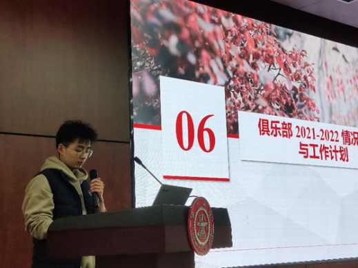 俱乐部副主席李天奇总结了2020-2021学年工作情况,俱乐部先后举办了学术沙龙、学术年会等活动,俱乐部成员斩获60余人次荣誉奖项,发表论文73篇,申请专利及软件著作权16项。俱乐部主席冯苗对俱乐部名称变更研讨过程、俱乐部章程、改革目标和改革举措等进行了详细介绍,指出后续将带领俱乐部成员以俱乐部章程为指导,将俱乐部打造成为博士生高水平培养、交流和展示的平台。副主席严嘉玮介绍了本届俱乐部的管理委员会、部门组成,以及2021-2022学年工作计划。在场师生还投票选出俱乐部的部旗和部徽,指导教师蔡伟伟为俱乐部授予部旗。