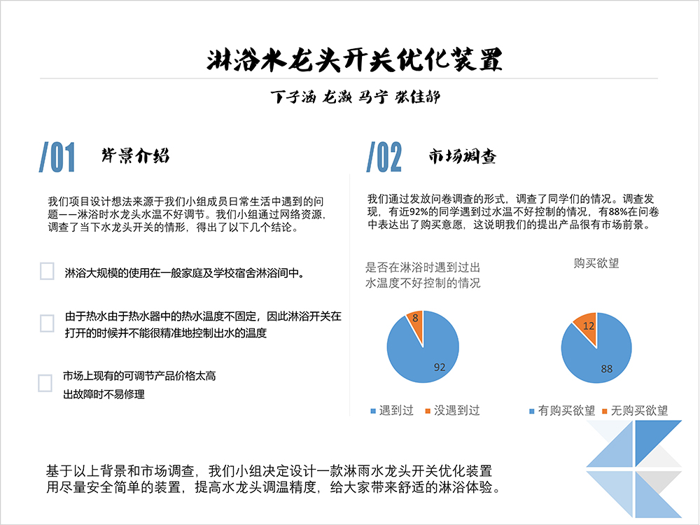 淋浴是当前老员工以及绝大部分家庭最常用的洗浴方式。但是现有的淋浴开关并不能很精准地控制出水的温度。前期调查显示,超九成的受调查者认为现有淋浴开关对水温控制不够合理,经常碰到淋浴喷头出水温度过高或过低的情况。轻轻旋转把手,水温便会大幅度变化,影响淋浴体验,也增加了烫伤的可能。目前市场上流行的智能水龙头不仅价格昂贵、只能调节固定的温度,出了问题也难以修理。基于这一现状,我们小组在课程设计中,致力于对淋浴水龙头开关进行优化,用尽量安全简单的装置,提高水龙头调温精度,给用户带来舒适体验。