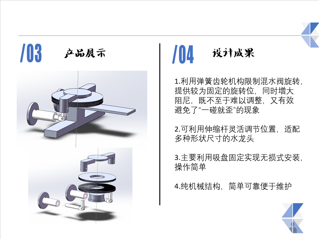 固定吸盘为产品的固定件,包括齿轮与龙头把手之间的固定、产品与墙壁之间的固定。