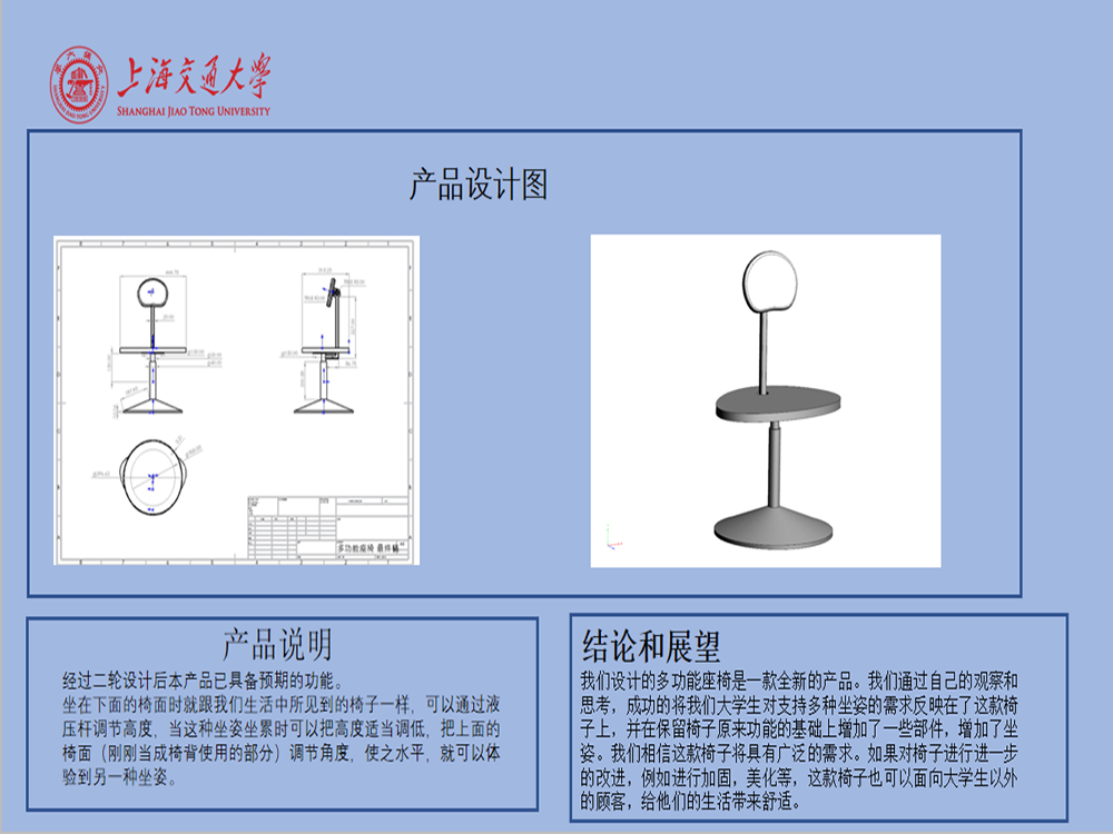 为满足设计目标,我们小组主要从底座、座位、靠背三方面进行构思、设计,取得了如下成果。