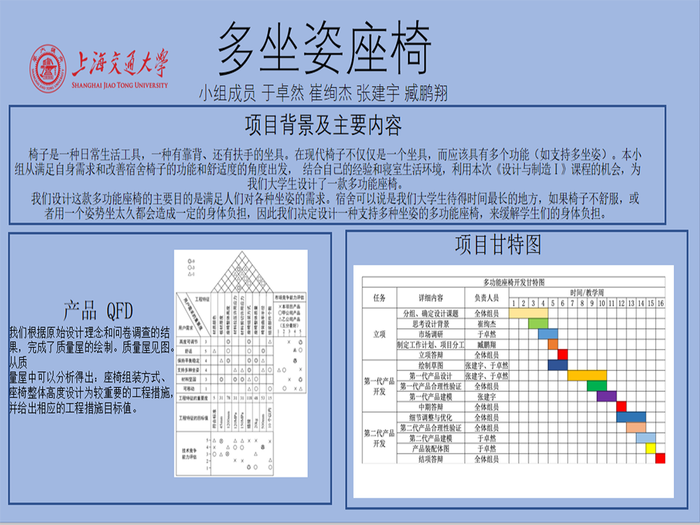 椅子是一种满足人们“坐”的需求的日常生活工具,公司宿舍中每人都配有椅子。在对老员工群体进行坐姿喜好等方面的问卷调查后,我们发现这一群体对椅子的期望超越了其仅仅作为一个坐具具备的功能,其中期望值最高的是希望座椅能够支持多种坐姿。本小组从满足基本需求和改善宿舍椅子的功能和舒适度的角度出发,结合自己的经验和寝室生活环境,利用这次《设计与制造Ⅰ》课程的机会,为我们大学生设计了一款支持多种坐姿的座椅。