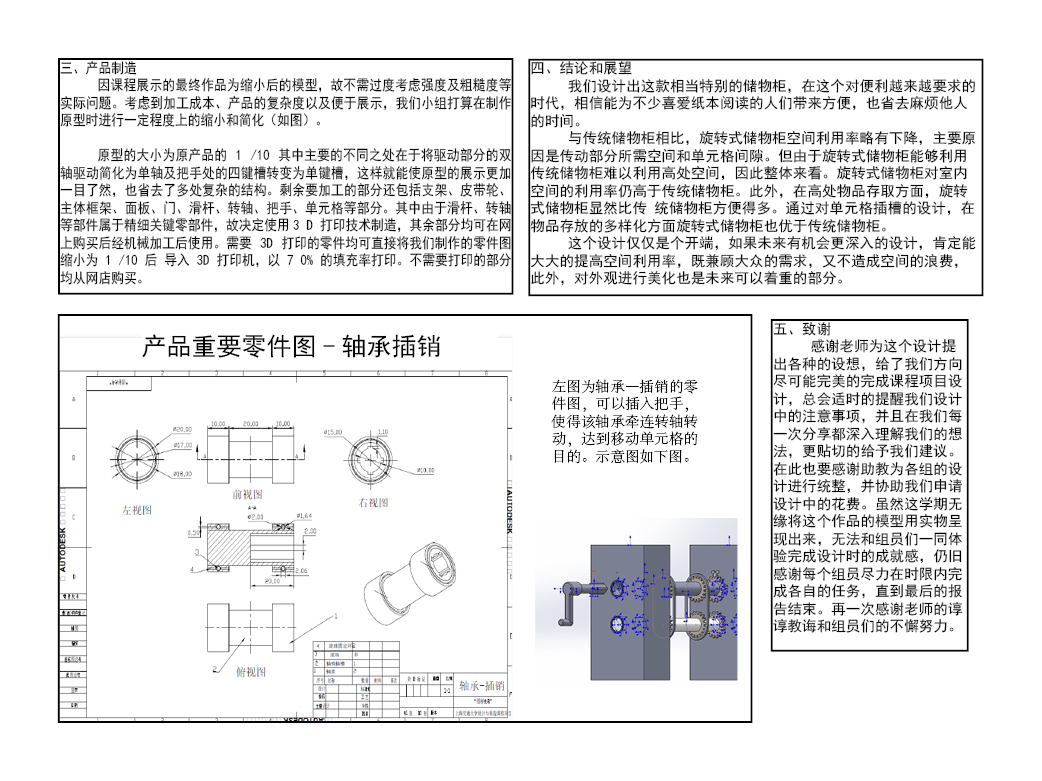 可以大大满足人们的需求,此设计的原型基本由3D打印而成并搭配支架及皮带轮。本产品在高处物品存取方面,显然比传统储物柜方便得多。通过对单元格插槽的设计,在物品存放的多样化方面也优于传统储物柜。
