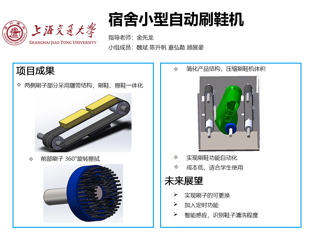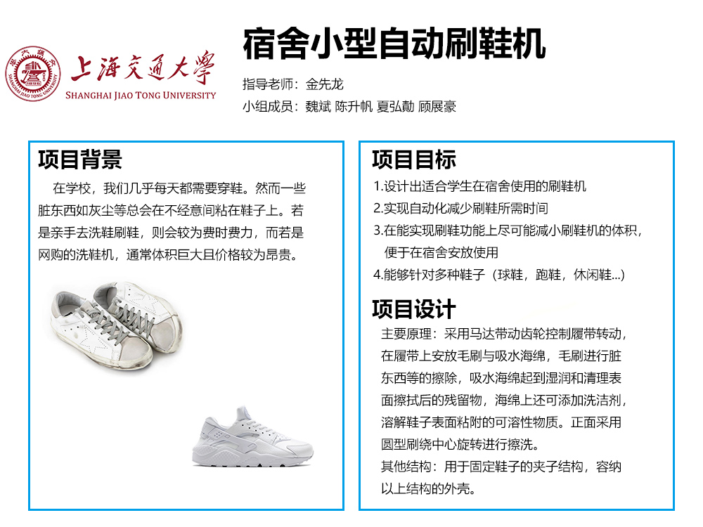 同学们生活中几乎每天都需要穿鞋,而鞋子有时又容易弄脏,擦洗鞋子便成了一个很头疼的问题。自己动手去擦洗鞋子既费时又费力,而在网上购买的洗鞋机又相对较大而且价格昂贵。针对这些问题,我们小组利用此次课程设计,希望能够做出一款适合员工使用的宿舍小型自动刷鞋机。不同于市面上的大功率洗鞋机,我们的产品不会有造成鞋子损坏的风险;又不像擦鞋机一样只能除灰。我们的设计能够在减小功耗及可能风险的同时,尽力做到最好的清洁效果。
