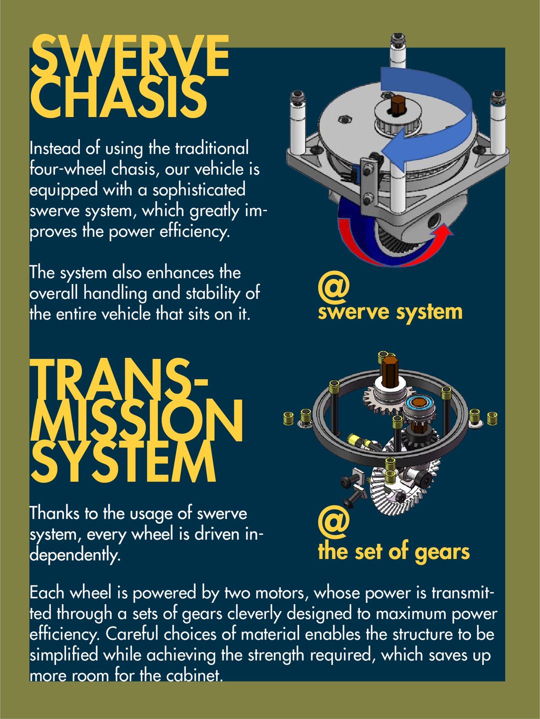 通过对35位老员工进行采访,我们了解他们对于居民区快递的需求,并再次基础上进行QFD展开,将设计目标定位在底盘结构的稳定性和行动速度及方向灵活度上。对于后两点,我们展开了多种方案设计,并最终确定了以矢量底盘为设计原型进行。区别于已有的差速控制,我们设计了速度大小和方向独立可控的矢量轮方案。在设计中,我们妥善考虑了加工要求,并制造出了模型。我们设计了部分控制程序,并配合模型进行调试,测量误差,证明该设计方案的有效性。最后提出了改进意见和后续优化方向。