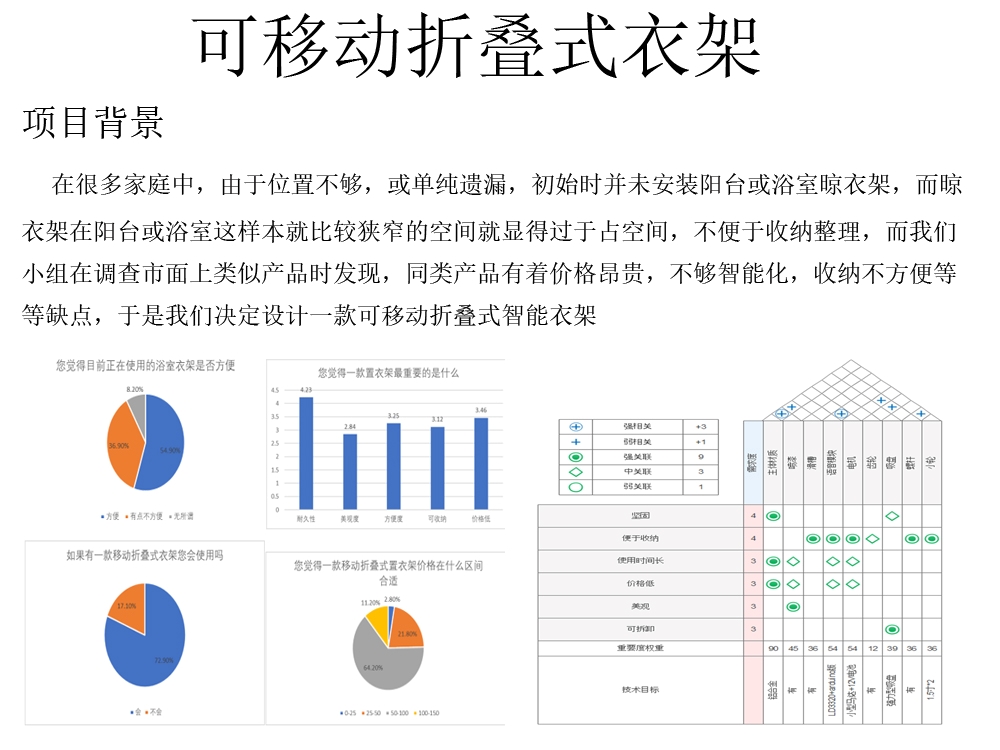 我们的目标是设计出一款能够在二维平面上,两个方向收缩的衣架,并控制在一定的成本内,以达到晾衣架最重要的坚固和耐久。通过市场调查,我们发现,需求度最高的前三分别是耐久性好,价格便宜,更方便。于是我们的设计全部主要围绕这三个核心需求进行设计。