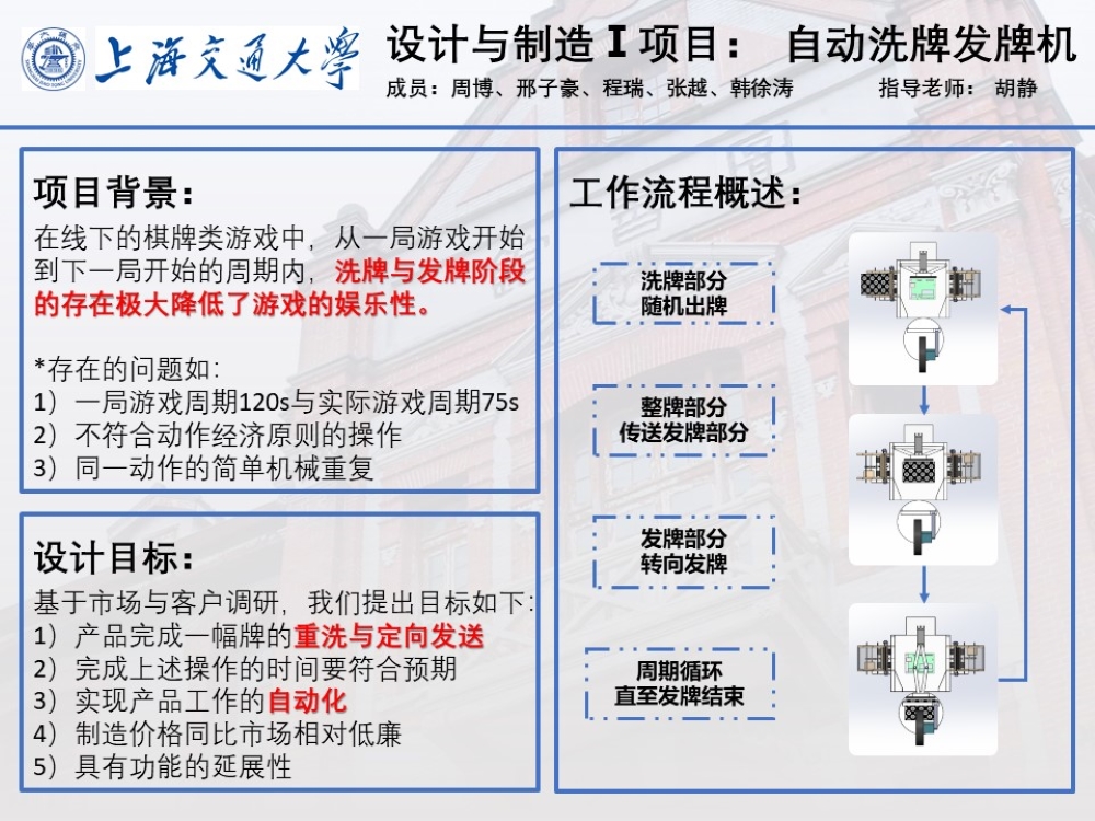本小组从“打牌时洗牌麻烦”这一实际问题出发,经过市场产品调研、客户需求调研后,运用QFD图,根据本学期所学的机械设计知识,制造了“自动洗牌发牌一体机”产品。将洗牌过程分解为“随机洗牌、机器内传送、定向发牌”三个环节,设计出相对独立的结构后并进行总体装配。通过Solidworks软件,本小组对产品进行了精美而细致的建模。同时,为了实现产品的自动化,本小组自行设计好产品总体的电动模块。虽然离校,产品的实体制造的进展也十分可观。