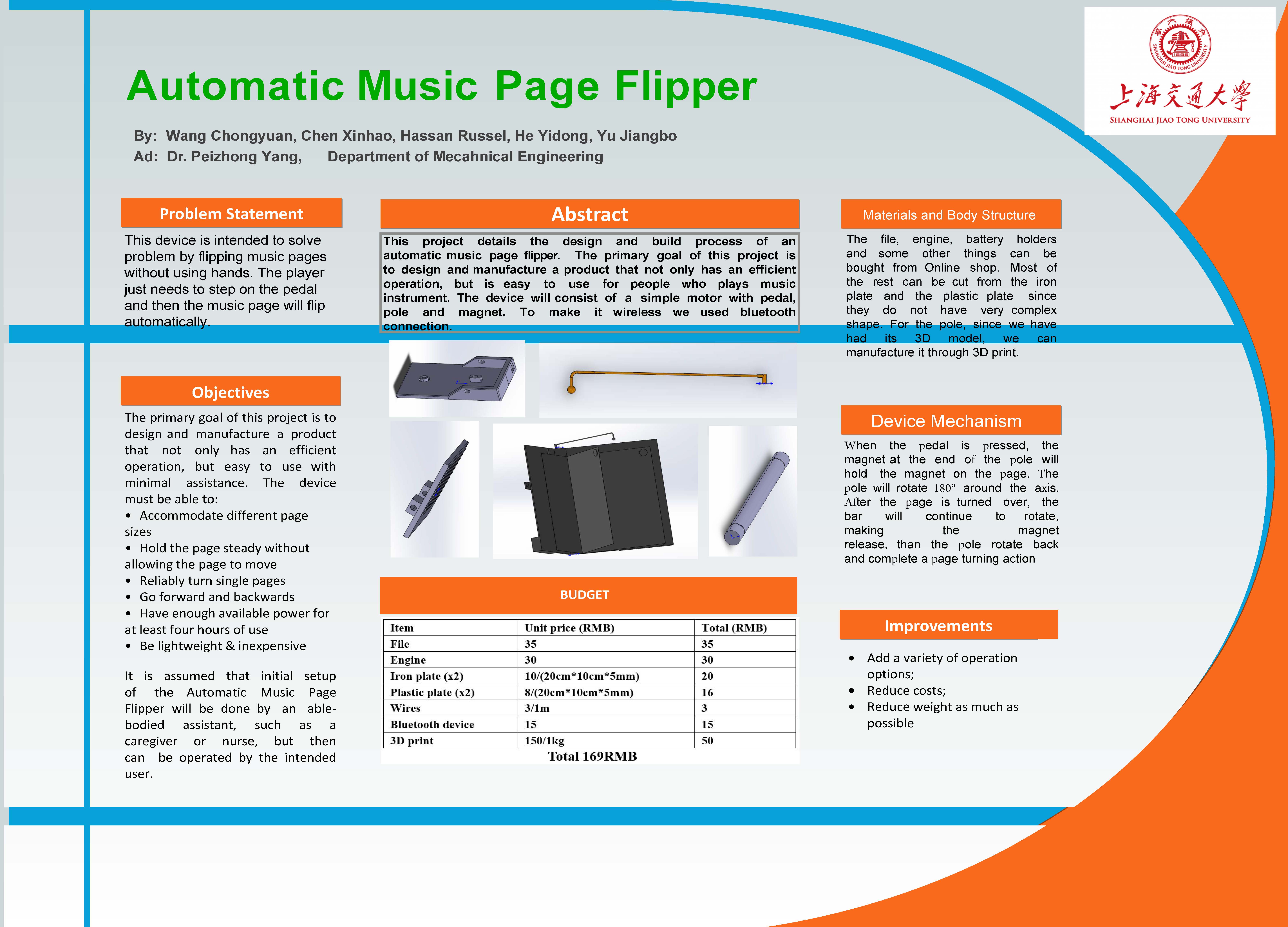 This product is used to solve to problem by flipping music pages without using hands. The player just needs to step on the pedal beside the piano pedal and then the music page will flip automatically. Once the pedal is stepped, the signal will be delivered to the flipper through Bluetooth. Then the engine will move immediately and the page can be turned by the magnet on the pole and the file.