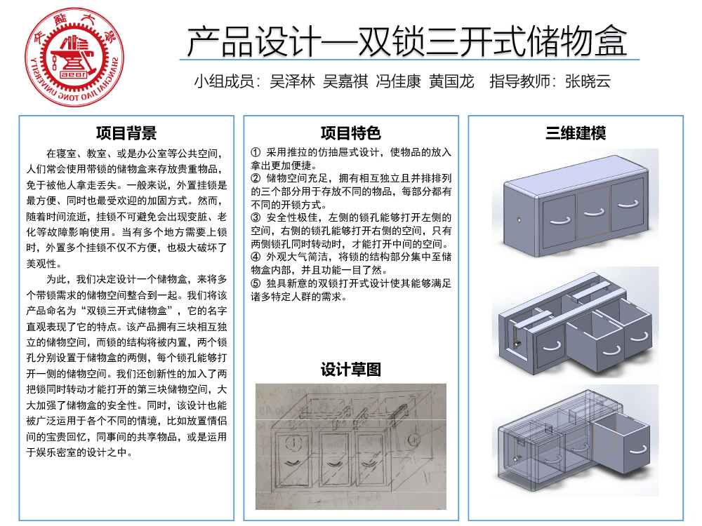 我们设计的产品是“双锁三开式储物盒”,它的名字直观表现了它的特点。该产品拥有三块相互独立的储物空间,而锁的结构将被内置,两个锁孔分别设置于储物盒的两侧,每个锁孔能够打开一侧的储物空间。我们还创新性的加入了两把锁同时转动才能打开的第三块储物空间,大大加强了储物盒的安全性。同时,该设计也能被广泛运用于各个不同的情境,比如放置情侣间的宝贵回忆,同事间的共享物品,或是运用于娱乐密室的设计之中。