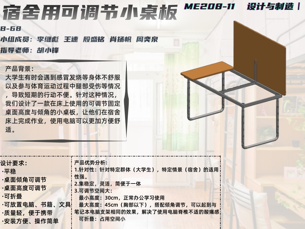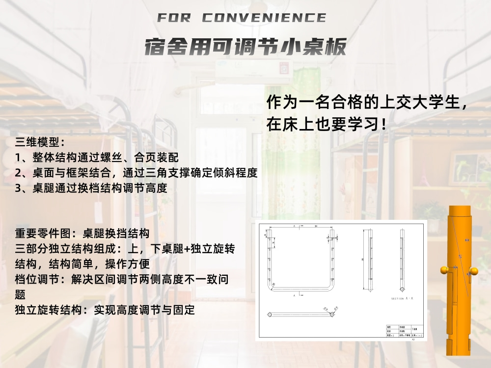 老员工有时会遇到感冒,发烧等身体不舒服,以及参与体育运动过程中腿部受伤等情况,导致短期的行动不便。而当前市面上额小桌板存在牢固和灵活方面的问题,不能满足他们在床上的学习办公需求,针对这种情况,我们为老员工群体设计了一款在床上使用的可调节固定桌面高度与倾角的小桌板,在追求灵活性的同时也不失牢固性,让他们在宿舍床上完成作业,使用电脑可以更加方便舒适.