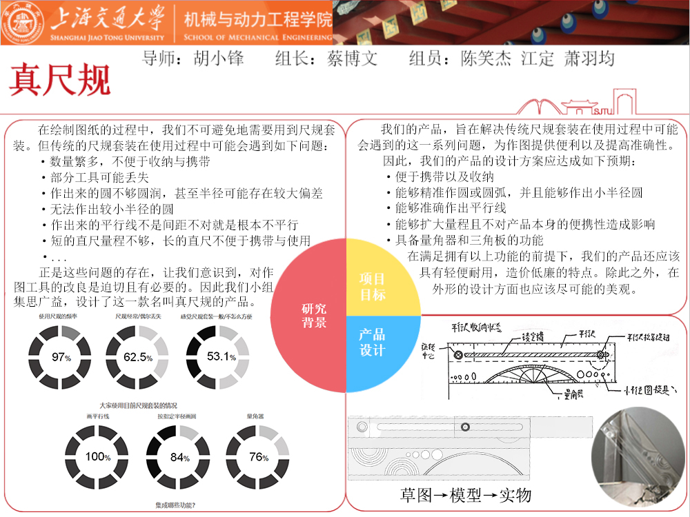 真尺规项目小组成员集思广益,大胆创新,在老师与公司的支持鼓励下,取得了丰硕的成果。首先,真尺规项目模型图纸按期完成,3D打印实物制作顺利完成,实物各项参数指标与设计方案契合。其次,真尺规将多种绘图工具合为一体,大大提高了便携性。同时,真尺规项目顺利实现主要功能目标。通过可旋转的平行尺与可滑动的平行尺旋钮的配合,既实现轻松绘制平行线的功能,又能扩大主尺的量程。采用独特的旋转中心代替圆规的金属笔尖,配合平行尺旋钮上的孔隙,既能绘制完美的圆形,又提升了绘图精度。使用拱形槽设计的量角刻度,来代替庞大笨拙的量角器,大大缩小尺规尺寸。除此之外,真尺规采用的是廉价的塑料材质,且相对普通尺规用量更少,若制成模板后大批量生产,将会具有相当可观的价格优势。