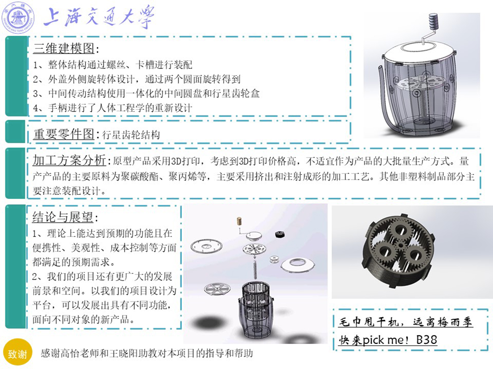 我们通过需求确定、基础设计、后期改进,以及加工分析,完成了此次项目的产品——宿舍便携式手动毛巾甩干机。这一款产品,针对宿舍的毛巾甩干问题而提出,目标受众明确,有市场前景。它能通过旋转、挤压结合的方式,快速甩干毛巾,且使用便捷。此外,它小巧玲珑,方便存储,适宜寝室使用。我们对它进行了后期的加工、成本、市场分析。我们的这一项目,过程严谨,成果丰富;我们还加入了许多富有创新性的元素,使其成为一款新颖的、优秀的产品。