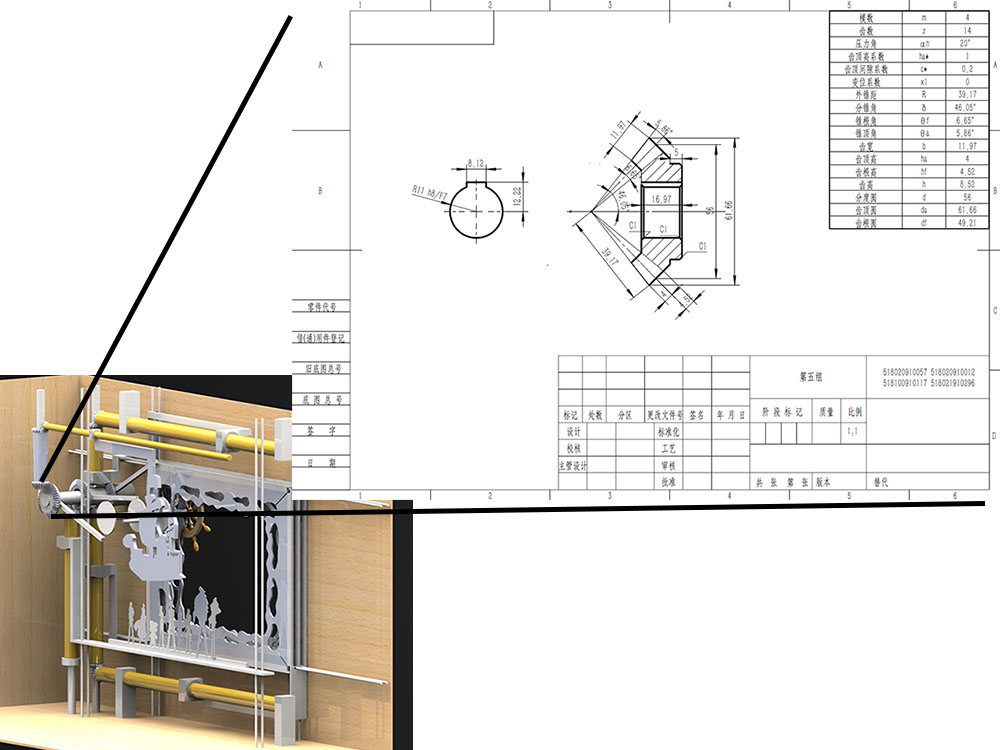 本组产品达到了设计预期,在传统达芬奇锁的基础上,我们小组创新性地改造了飞轮,在飞轮上增加曲槽,和密码盘上的连杆配合,实现用锁芯转动控制展示流程的启动。展示部分结合密码位数做了流程分割,用接触式机关控制背灯作最后的照明。最终实现用户每输入一位正确密码,就可以转动独立旋钮,让背景浮现、人物升起、小船启航。用SolidWorks对所有零件建模、装配和动画模拟,并根据预期效果进行材质渲染,以贴近实物效果。