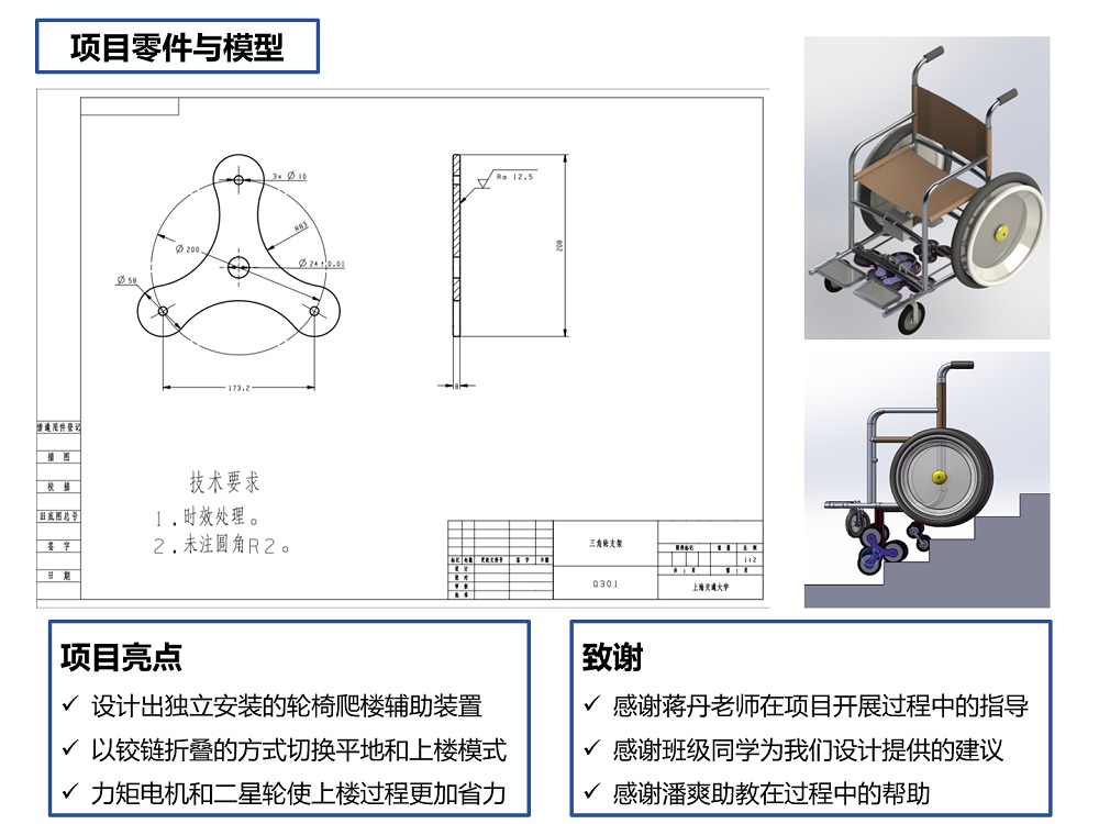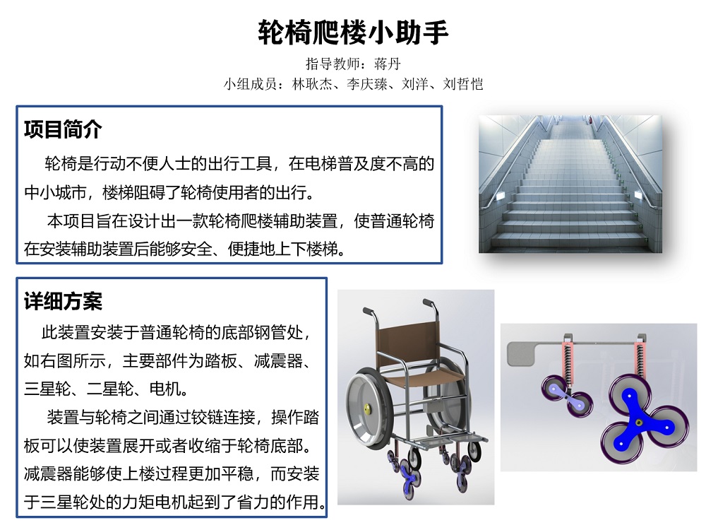 本项目设计了一款可安装于已有轮椅上的爬楼辅助装置,使普通轮椅也能够安全、便捷地上下楼梯,并大大节省了客户所需成本。