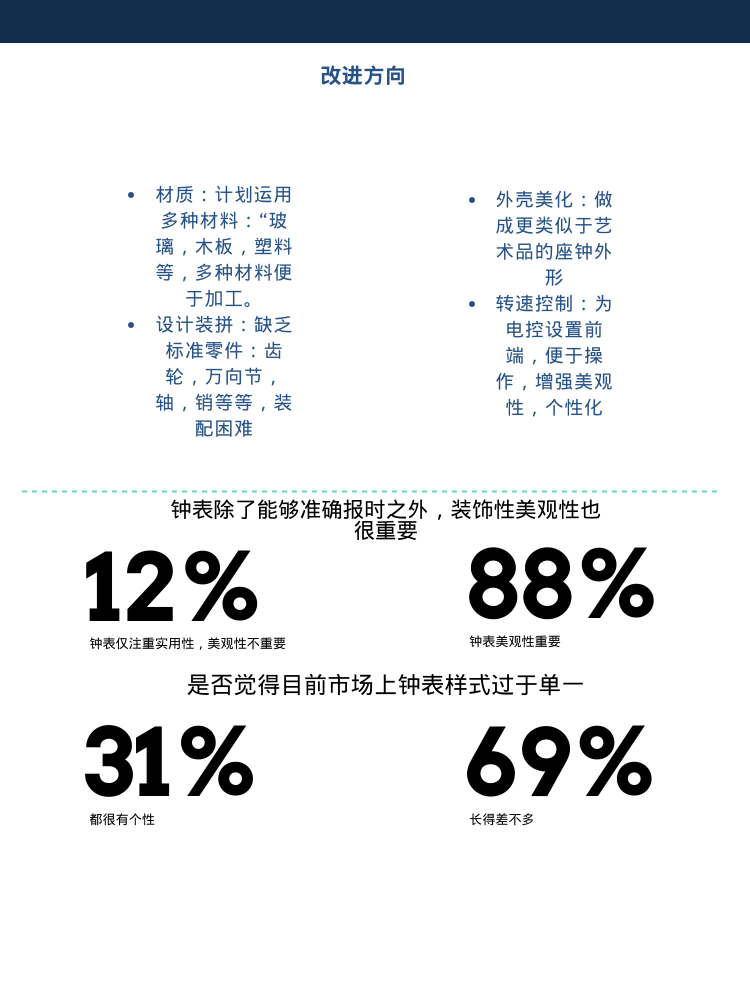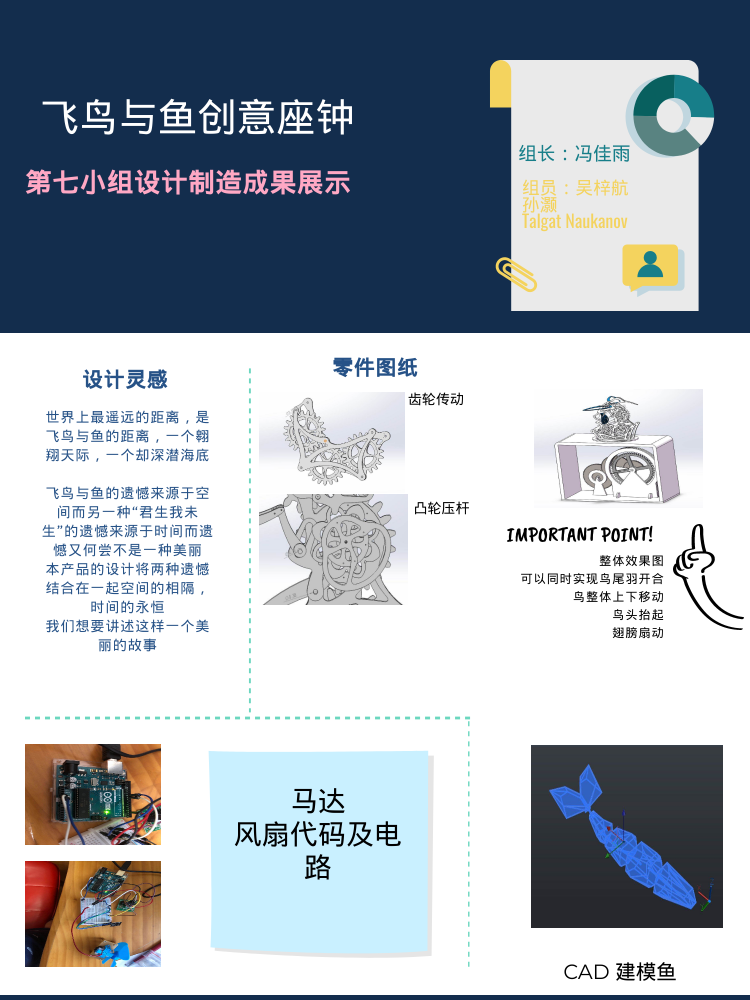 本小组做的项目是设计一款带有飞鸟造型的创意座钟。运用了齿轮、齿条、凸轮压杆、键槽等多种传动方式实现了鸟的运动和钟表转动,并且可以控制飞鸟的运动频率。本产品兼具实用性、美观性和趣味性,能够在准确报时的基础上满足观赏的需要,并且能够由用户轻松自主拼装,体验拼图乐趣。此项目的灵感来源于香港的一首诗:“世界上最遥远的距离,是飞鸟与鱼的距离,一个翱翔天际,一个却深潜海底。“我们希望用户在使用时也能感受到这种距离带来的美。