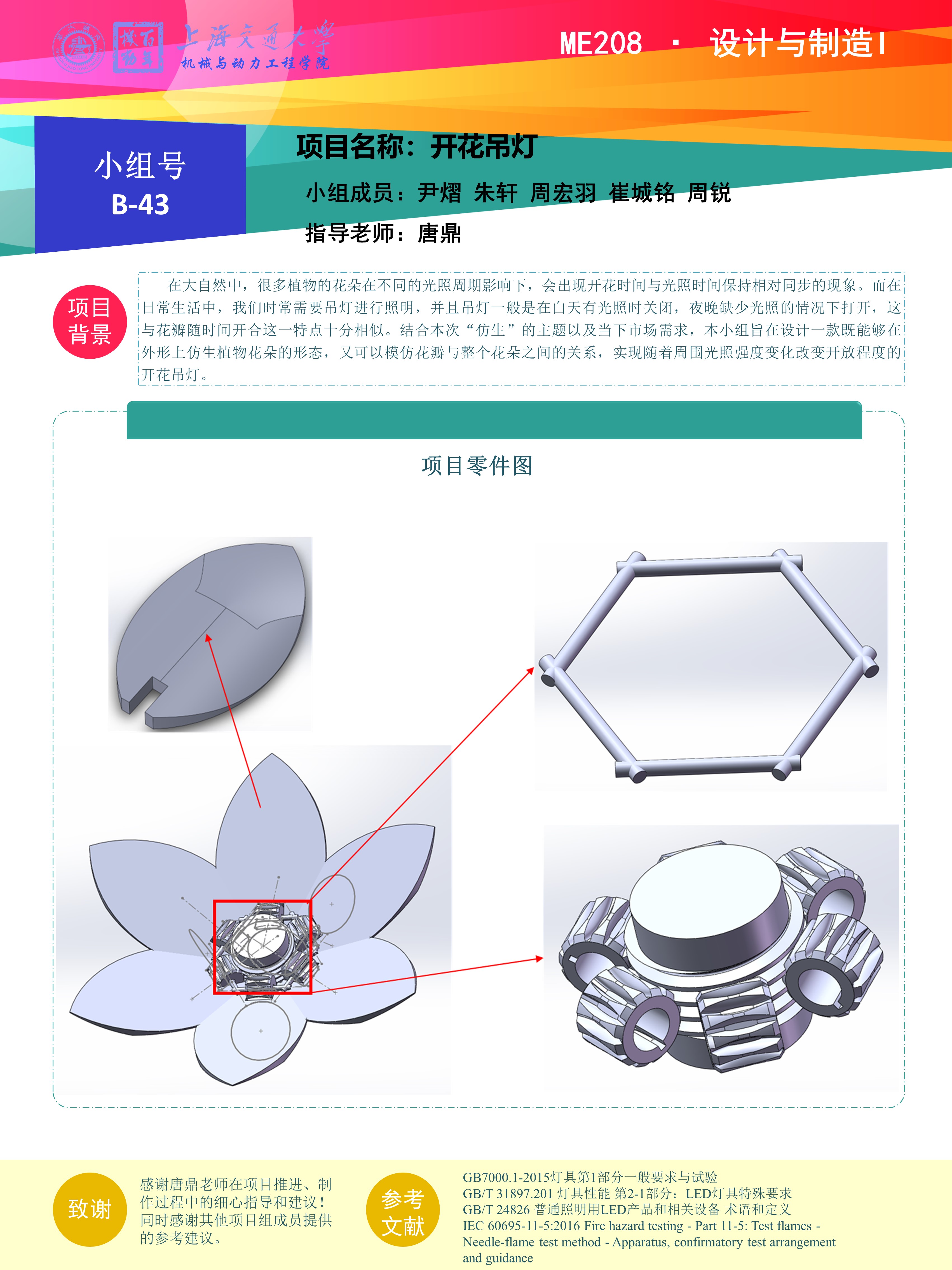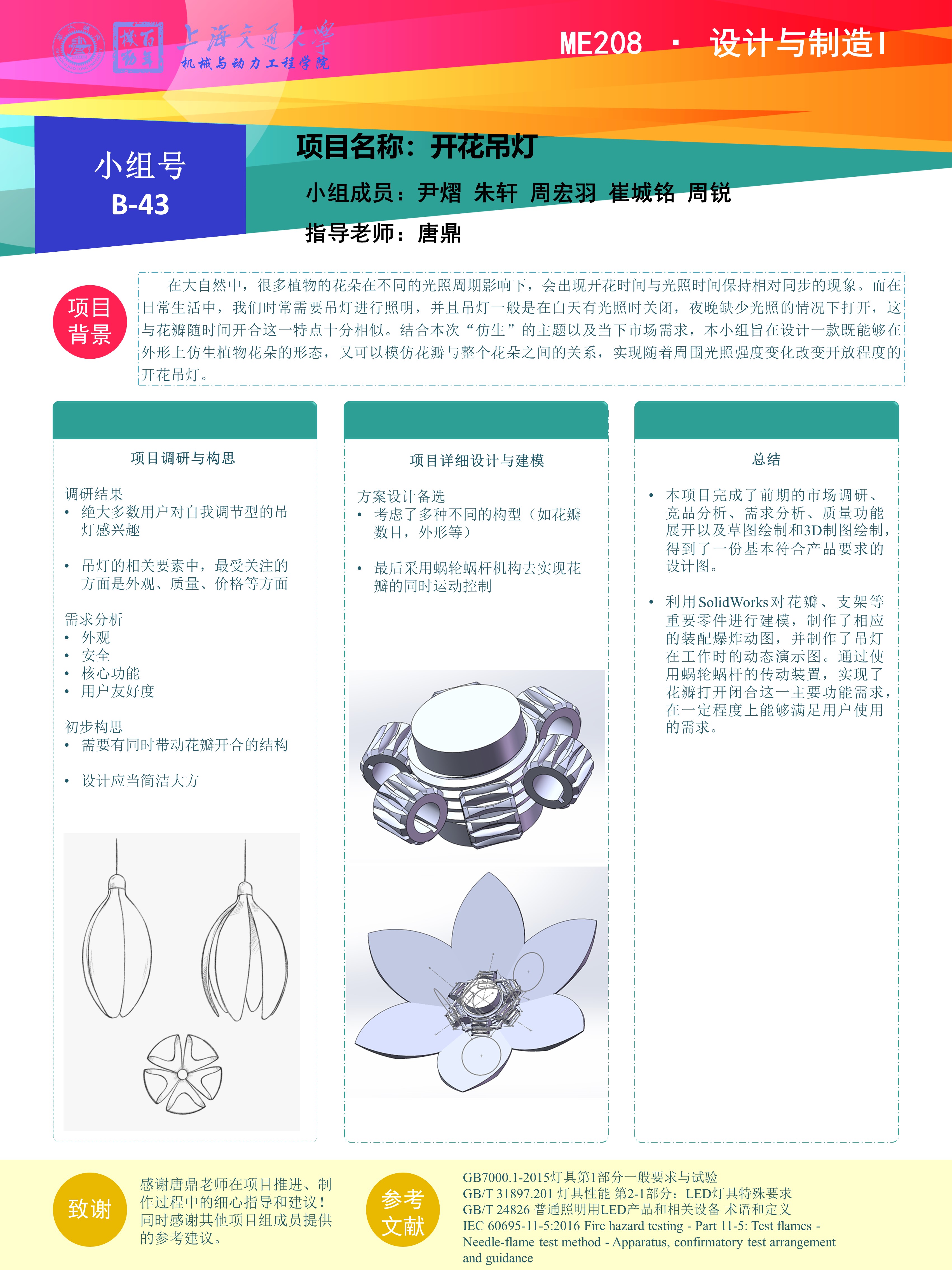 本项目完成了前期的市场调研、竞品分析、需求分析、质量功能展开以及草图绘制和3D制图绘制,得到了一份基本符合产品要求的设计图。本产品利用Solidworks对花瓣、支架等重要零件进行建模,制作了相应的装配爆炸动图,并制作了吊灯在工作时的动态演示图。通过使用蜗轮蜗杆的传动装置,实现了花瓣打开闭合这一主要功能需求,在一定程度上能够满足用户使用的需求,但是尚未实现自我调节等功能。由于无法在公司加工零件,在材料、加工方式等方面尚未有充足的考虑。