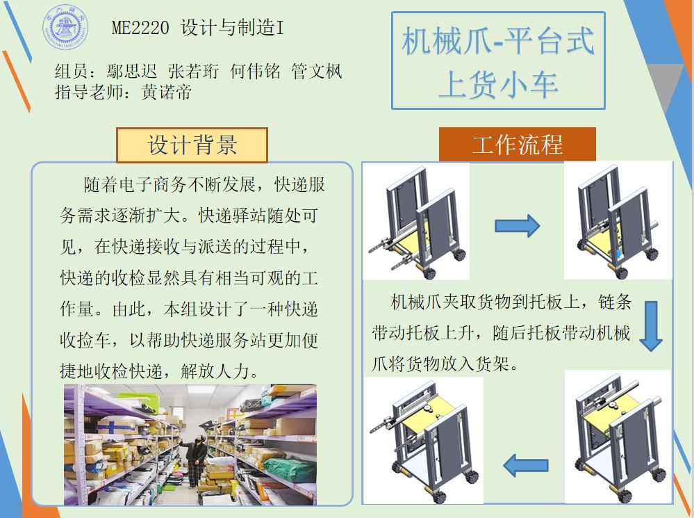 我们希望设计一款能够自动上货的快递小车,帮助人们快速而省力地将送来的快递传达到指定的货架上。应用场景主要为货流量大的快递驿站,初始设置背景为公司驿站。当快递集中送达时,快递小车能够快速识别快递并送达指定货架,从而使员工能第一时间收到快递。我们的注意力主要集中在小车将货物从地上送达货架的过程,使用可靠的货物抓取装置;为了简便和快速,采用平台式上升方式,设计更加简单且易于维修;通过链条带动平台运动,插孔设计使得链条只需要单向运动,简化了动力装置。