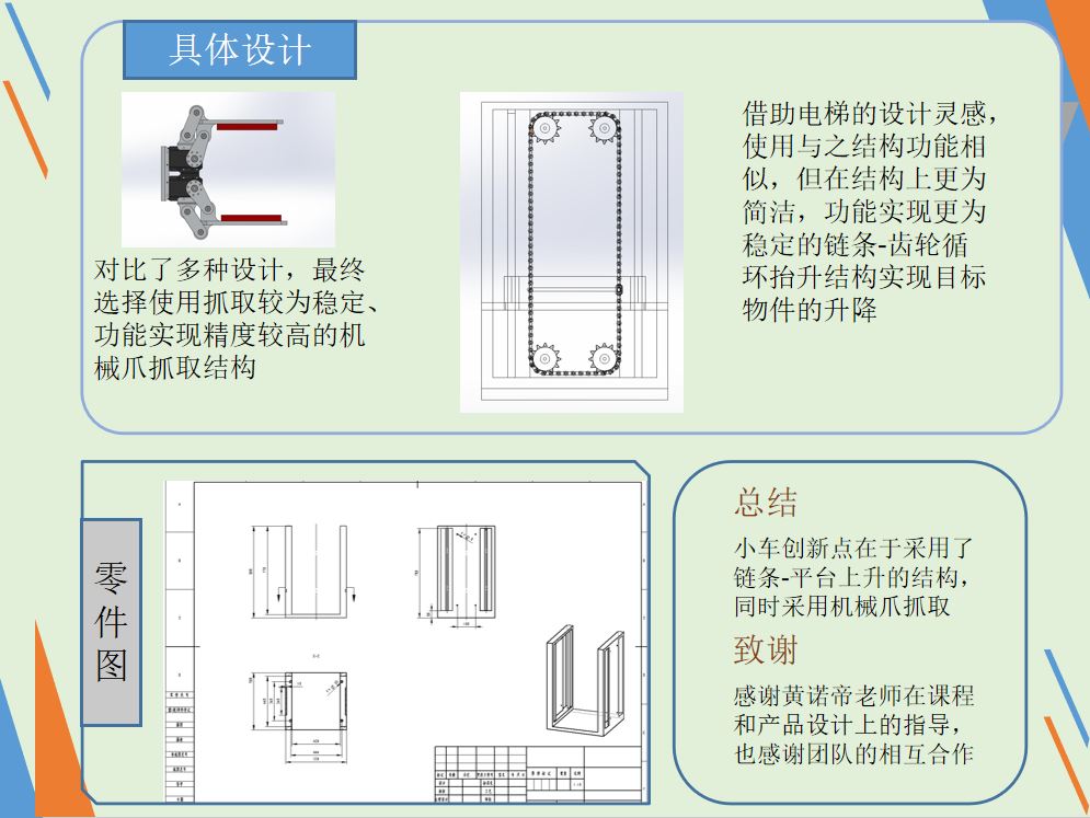我们完成了小车的基本架构,做出了其3D模型。抓取装置采用机械爪,爪子平行特性能够适应各种大小的快递。机械爪伸缩由杆件连通齿轮带动,实现机械爪的进出。平台为一块和链条相连的托板,连接处为一条槽,当链条运动时,卡扣会带动平台上升;到指定高度时停下,机械爪将货物夹出;之后链条继续运动,平台到最高点时,卡扣开始沿着槽运动,运动到另一边后带动平台下降,完成一次任务,期间链条单向运动,利于控制系统简化。