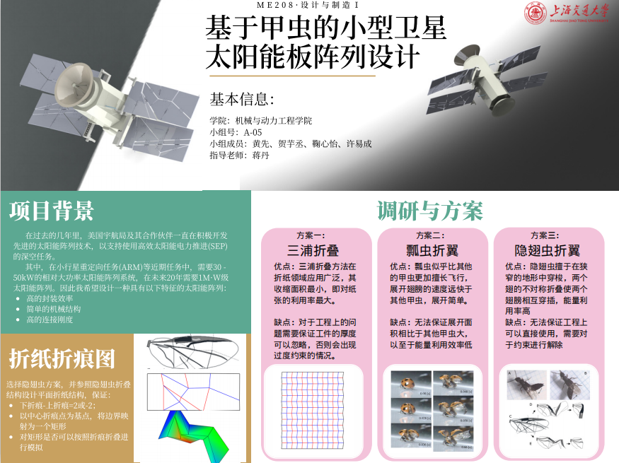 随着科技水平的发展,人们对于宇宙的探索日趋深入,小型卫星作为探索宇宙空间的重要工具被广泛使用。我们注意到,能源问题一直是卫星制造过程中的重点,为了保持长时间的续航,卫星会搭载太阳能板以提供动力,而太阳能板的结构设计中涉及如何使折叠体积小、展开过程稳定、展开后面积大等问题。本作品聚焦于改良小型卫星太阳能板的结构,通过仿生Rove Beetles的翼翅结构设计太阳能板折纸结构,利用合页与高应变弹性材料组合连接各块太阳能板,提高封装率,实现紧凑折叠与大面积展开。