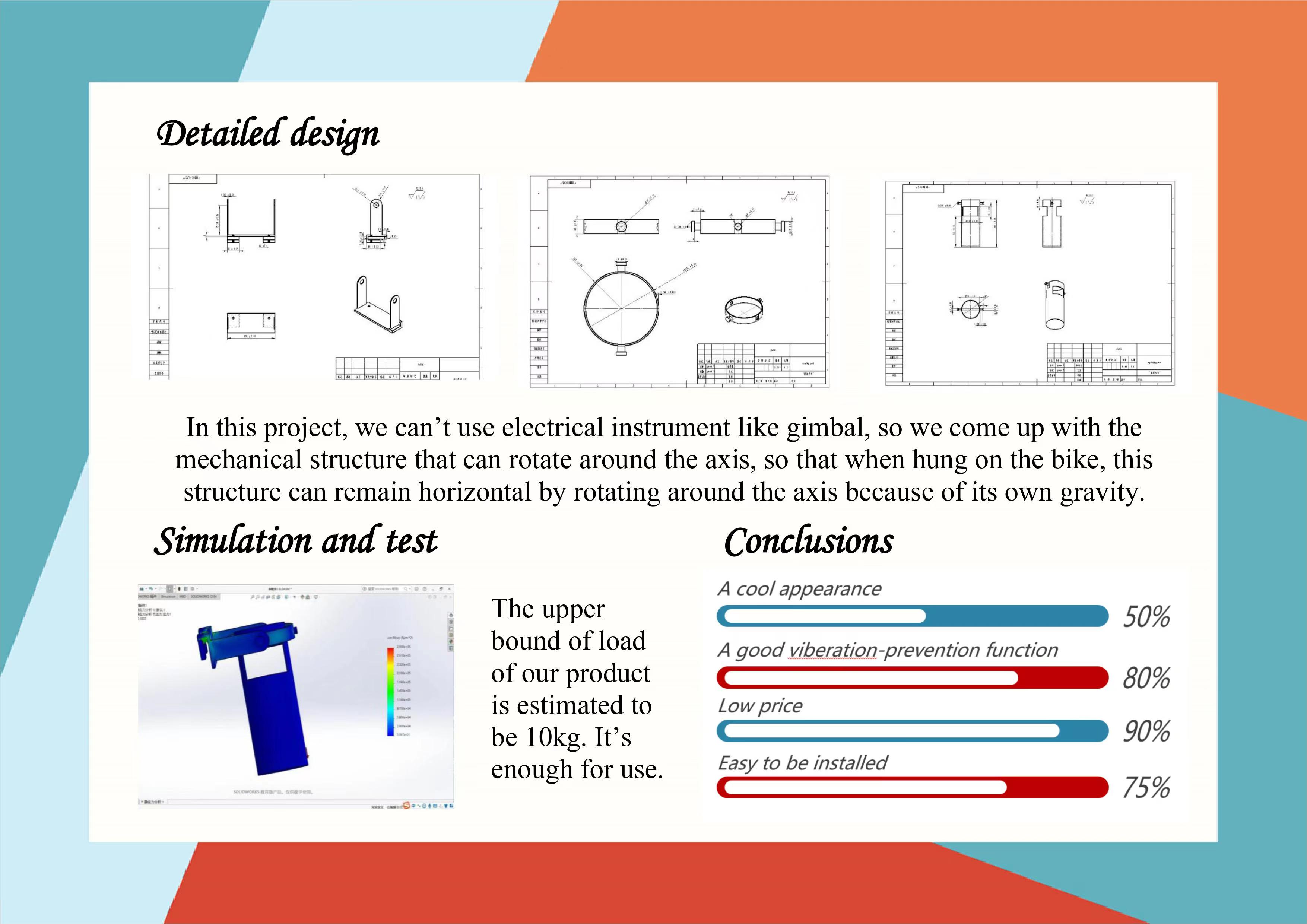 本项目通过市场调研挖掘出不同人群对于稳定杯架的性能需求和价格期望,,并根据有需求的人数比例来确定每个的设计目标的权重,从而出该设计。该装置可以悬挂自行车篮或者自行车把手上,它的尺寸适用于市面上大多数自行车。它实现了在重力的作用下,杯架可以分别绕两个轴各自转动,使杯架始终处于水平状态,从而达到防止倾倒泼洒的目的。