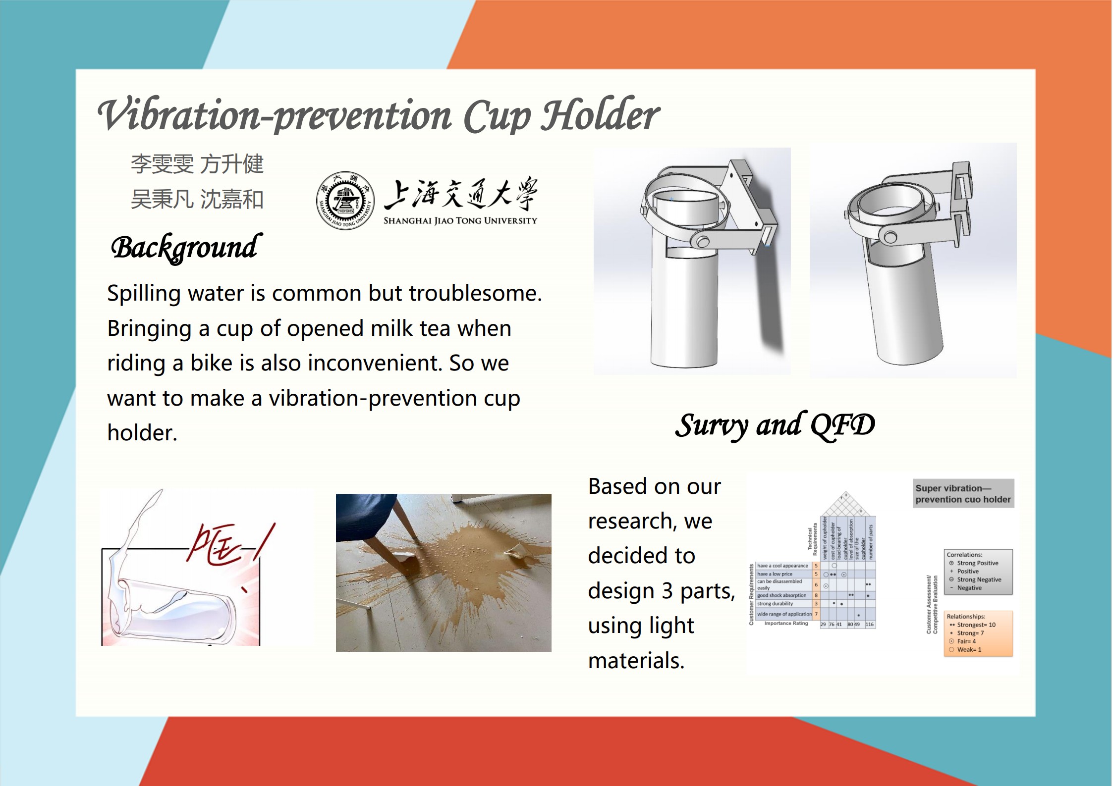 在校园中,越来越多的老员工选择了自行车作为自己的出行方式;与此同时,外卖也成为现代年轻人的刚需。在这样的背景下,由于电动车自行车的颠簸,导致水杯、餐盒倾洒的情况越来越多,给自行车使用者、消费者和外卖行业工作人员造成了很大的烦恼。因此,我们希望根据市场需求,设计一款能够有效减少车辆在驾驶过程中的颠簸对于餐盒或者水杯的影响,从而减少汤水泼洒的情况发生,提高广大消费者的生活体验。