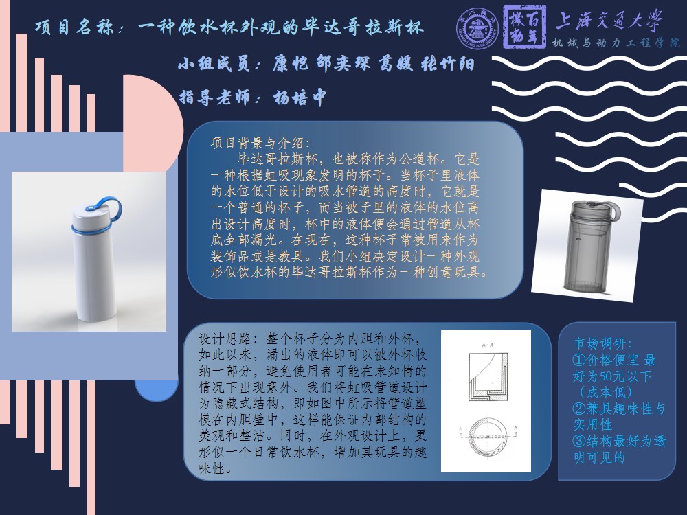 毕达哥拉斯杯,也被称为公道杯,它是根据虹吸现象发明的一种杯子。当毕达哥拉斯杯里的液体低于一定水位时,就是一个正常的容器。而当杯中液体高于设计好的水位时,杯中的液体就会通过虹吸管从杯底漏光。在现代,这样的杯子经常被用作装饰。而在市场调查中,我们发现很多人并不了解毕达哥拉斯杯,所以我们小组决定设计一个现代化的毕达哥拉斯杯玩具来展示这一古老的智慧创意。