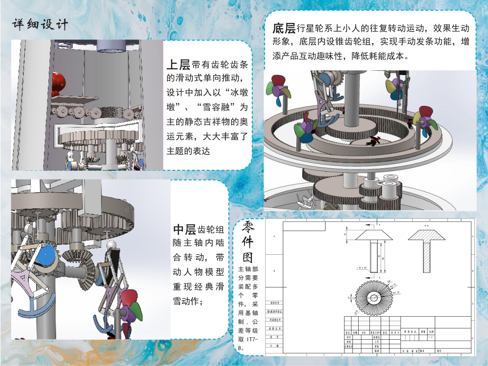 3. 中层齿轮组随主轴内啮合转动,带动人物模型重现经典滑雪动作;