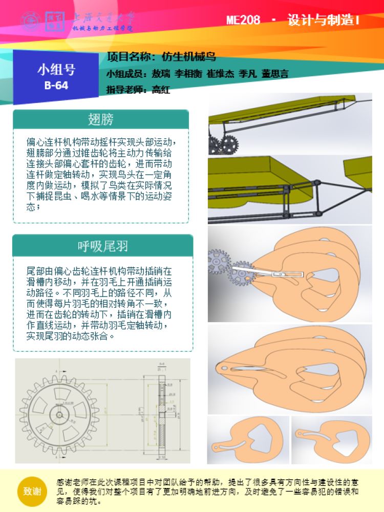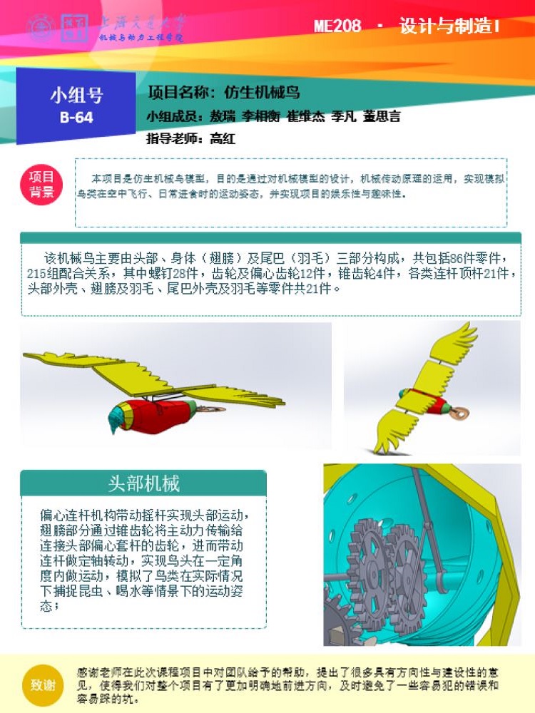 本项目是仿生机械鸟模型,目的是通过对机械模型的设计,机械传动原理的运用,实现模拟鸟类在空中飞行、日常进食时的运动姿态,并实现项目的娱乐性与趣味性。