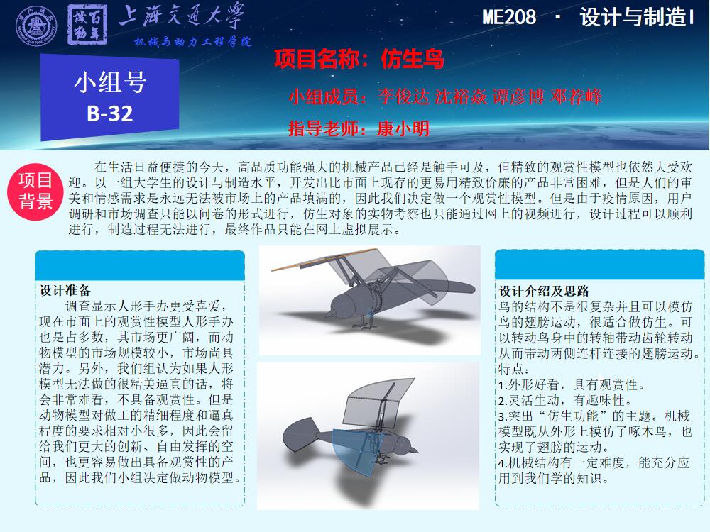 我组项目是一个啄木鸟的仿生模型,该模型以观赏性为主,还具有一点娱乐性和趣味性。模型特性是灵活、真实、美观,规格在500×500×200左右。在模型外形上,我们在大体上仿照了啄木鸟,舍弃了一些细节。在功能仿生上,我们实现了啄木鸟翅膀的扇动。关于使用到的设计与制造相关技术,模型翅膀采用了曲柄连杆结构,通过大小齿轮带动翅膀的扇动;模型头部和身体分离,留给关键结构更多空间,提高了制造时的容错性。