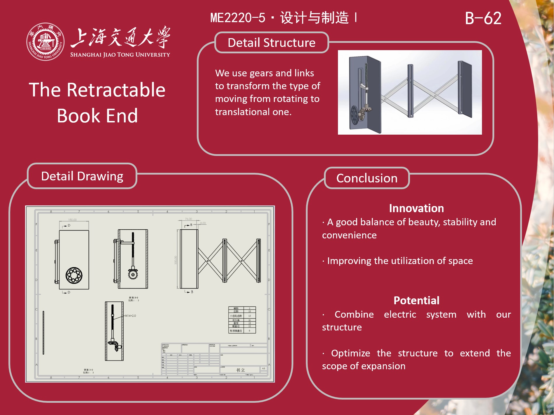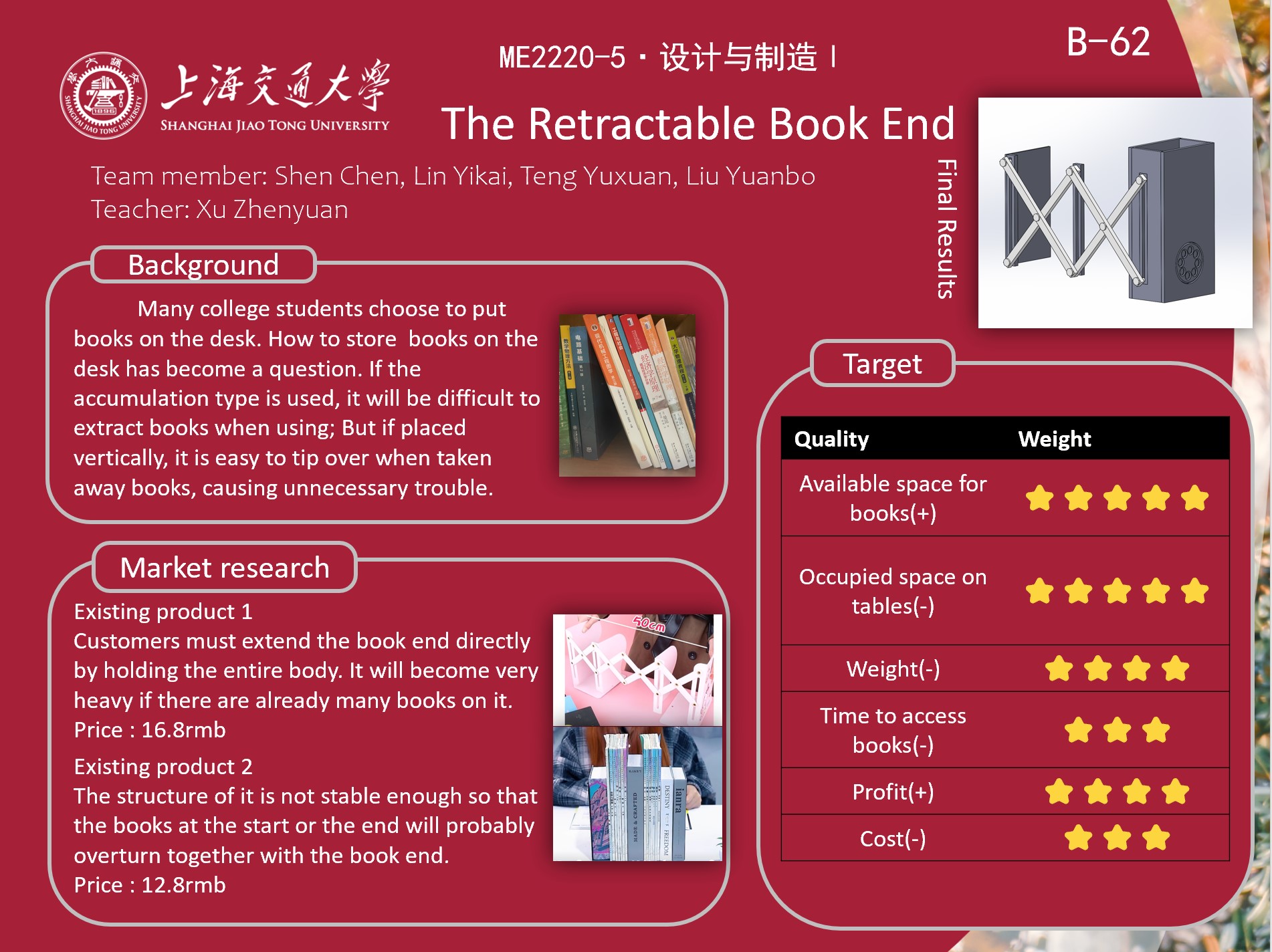 As college students, there are many books in our dormitory, but the shelves in the dormitory can't accommodate so many books. Many college students choose to put books on the desk, however, it is not so easy to store such a large number of books on the desk. Our team members proposed many possible solutions, and we combined the characteristics of these ideas to design a retractable book end, hoping to solve the problem.