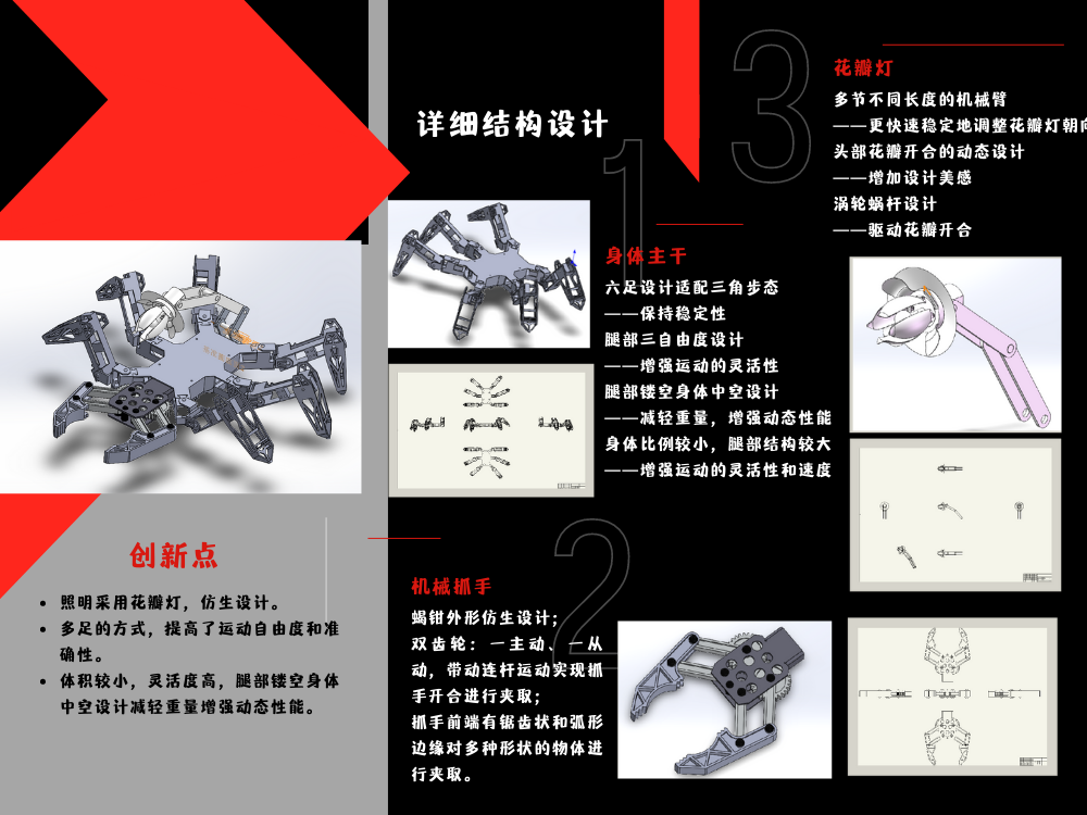 本项目的项目起因第一点是人们的日常生活需求,当物品掉入狭小且黑暗的空间时很难寻找并取出,尤其是对于老人和一些行动不便的人,第二点是灾难现场的搜救需求,一些狭小的缝隙搜救人员和搜救犬无法进入,需要一种自主性较高的搜救机器人。调研中我们发现搜救机器人大都速度慢、效率低、灵活性差,所以在结合了小组成员的讨论成果和任课教师的帮助后,本产品目标是设计并制造一款拥有蝎子外形的六足机器人,前置机械抓手用以抓物,后置花瓣外壳包裹的照明和摄像装置;设计除了需要满足抓物准确、稳定性好、照明等基础指标的同时,也尤为重视提高运动的自由度和准确性、进入狭小黑暗的空间搜救的能力和提高搜救效率。