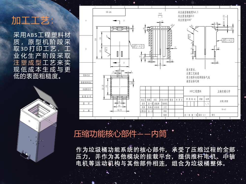 我们希望开发一款可以实现自动压缩、自动打包、自动换袋等功能的垃圾桶,采用机电一体化的设计,同时实现机械和电气两种方式的控制,以电气系统作为核心部分,机械控制作为辅助系统应对电子系统故障或是电源供电不足的情况,实现垃圾桶的高可靠度。我们还希望实现垃圾桶功能结构的模块化设计,最大限度提升这一复杂机电系统在维护、升级、维修等方面的快速性和简便性,并且通过合理设计的零部件,兼顾功能的多样性与生产工艺的低成本。