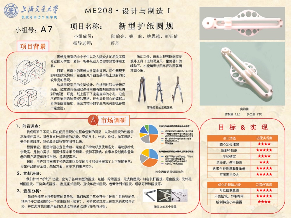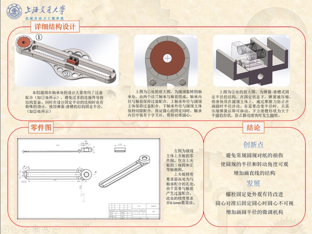 圆规是所有的中小员工以及人数众多的相关工程专业老员工、老师、相关从业人员需要频繁使用工具。但是目前,市面上的圆规大多采用尖脚设计,在绘图过程中会损坏纸张,不仅影响图纸的美观和整洁,还会导致圆心的偏移从而降低绘图精度,而且对较小的员工造成潜在危险。除此之外,市面上现有圆规需要额外工具的辅助下,才能确定绘图半径和圆弧所对圆心角。所以, 本项目旨在设计一种新型圆规,主要针对圆规画圆半径角度直读和防止圆规对纸张的损害两个问题进行探索。