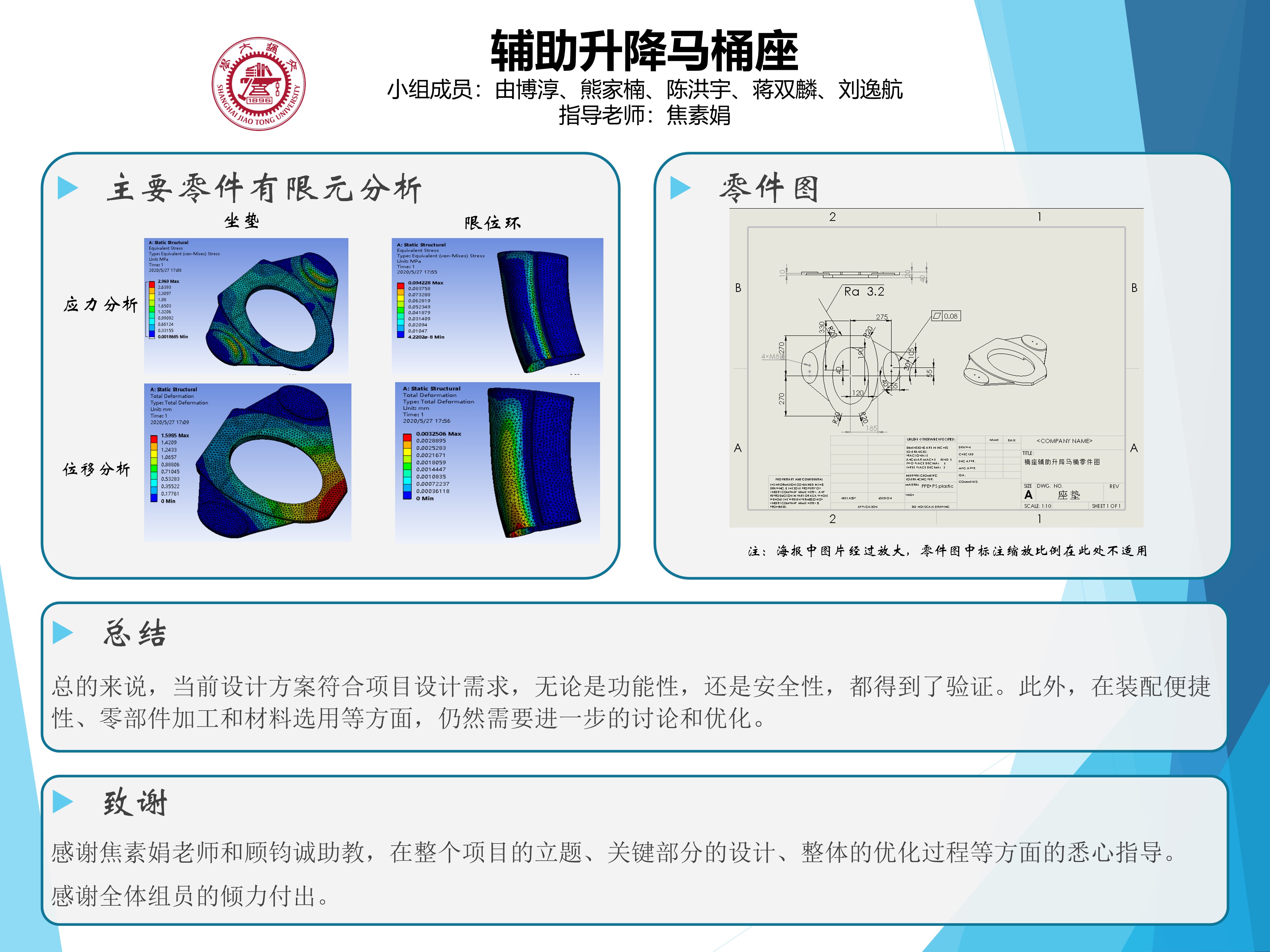 小组针对腿脚不便的老年人或残疾人设计了辅助升降马桶座,完成了社会调研、QFD分析、详细设计等步骤。QFD分析确定了产品重要特征和参数;详细设计环节中,机械部分用solidworks软件完成了底座、动力装置、支撑限位结构、坐垫、扶手、紧固件等主要结构的建模和装配,绘制零件图和工程图,并进行合理的有限元分析和材料选择,完成了数字样机的初步建立。电路部分完成了单片机、负反馈装置、电源、开关等元件的结构分析和方块图绘制。虽为制造实体样机,但前期设计基本符合要求,完成度良好。