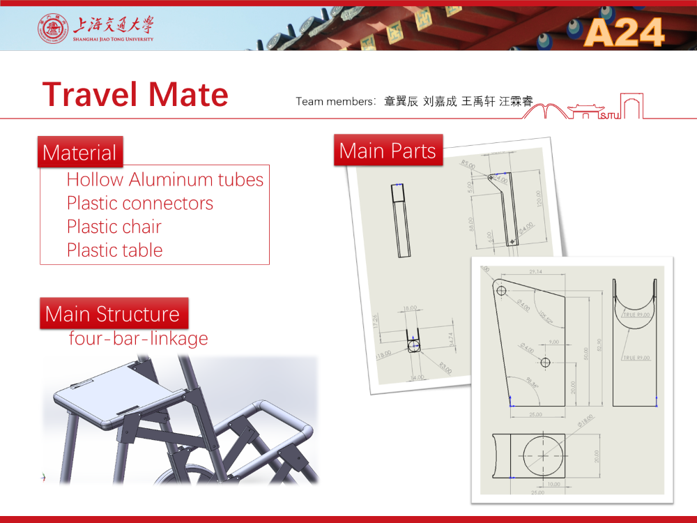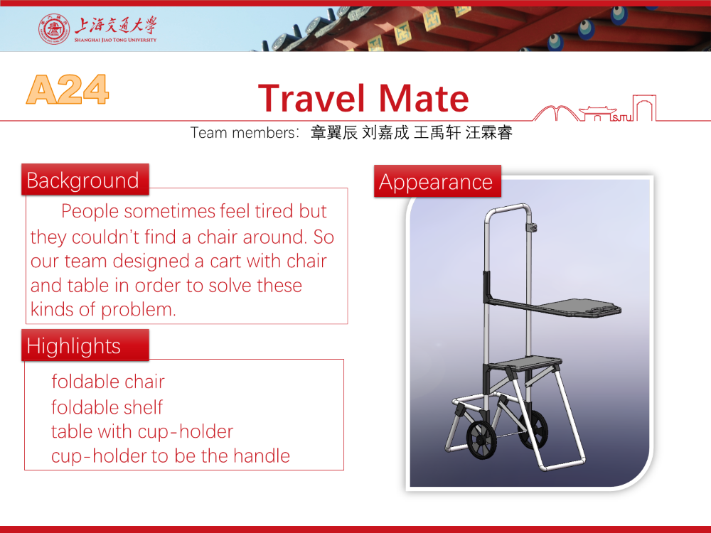 Our group focused on the use of handcart. Although it is common in our daily life, we believed that there is still space for improvement, and we could add extra functions for handcart by our design. By sending questionnaires and doing several researches, our group found out that many people have been caught in the situation that they could not find a seat outside when they are tired. In spite of some of the handcart with a seat sold in the market, we supposed these products are either hard to operate or too expensive. Furthermore, we also assumed that people need a table when they are siting on the chair of the handcart. Therefore, we designed our project, named Travel Mate, which had a foldable chair and foldable table. We used connecting rods to fold the table and the chair. Besides, in order to save the cost and decrease the weight, we use aluminum pipes as the main part of the structure. We also added a lock to keep the table folded. In this way, people can carry things with this Travel Mate and they can sit on it whenever they are tired, and they can place their drinks and even write on the table.