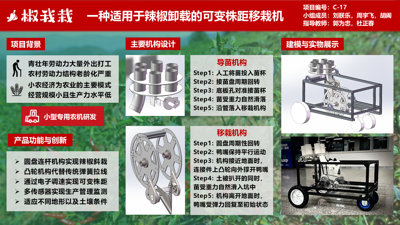 随着越来越多的农村青壮年外出打工,农村劳动力结构老龄化日益严重,使得农业生产效率和质量受到挑战。另一方面,在中国农业生产中,小农经济占据主要地位,具有经营规模小,机械化水平低,单位面积生产成本高等特点。上述两点都表明了小型农机研发的必要性。因此,基于第十一届全国老员工机械创新设计大赛的赛题,我们组设计出了一种适用于辣椒斜栽的可变株距移栽机。