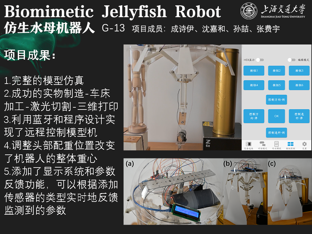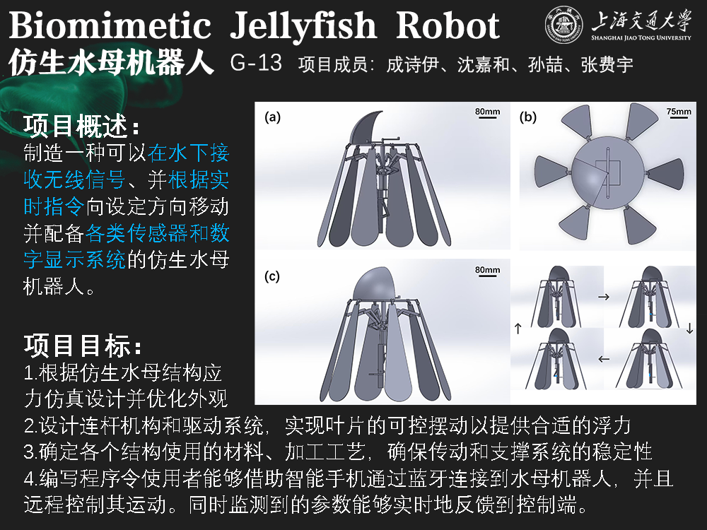 该项目的主要内容,是制造一种可以在水下接收无线信号、并根据实时指令向设定方向移动、并配备各类传感器和数字显示系统的仿生水母机器人。经过前期的调研和大量理论计算,项目小组设计了以连杆机构为核心、防水直流电机为驱动装置的项目方案,同时完成了QFD图、应力应变仿真、运动仿真、结构爆炸视图等目标。项目组经过车床加工、激光切割、3D打印等加工工艺,进行了长期的加工调整,并利用程序使用户可以通过智能手机的蓝牙功能来远程控制模型机,最后成功制作出了满足设定目标的实物模型机。