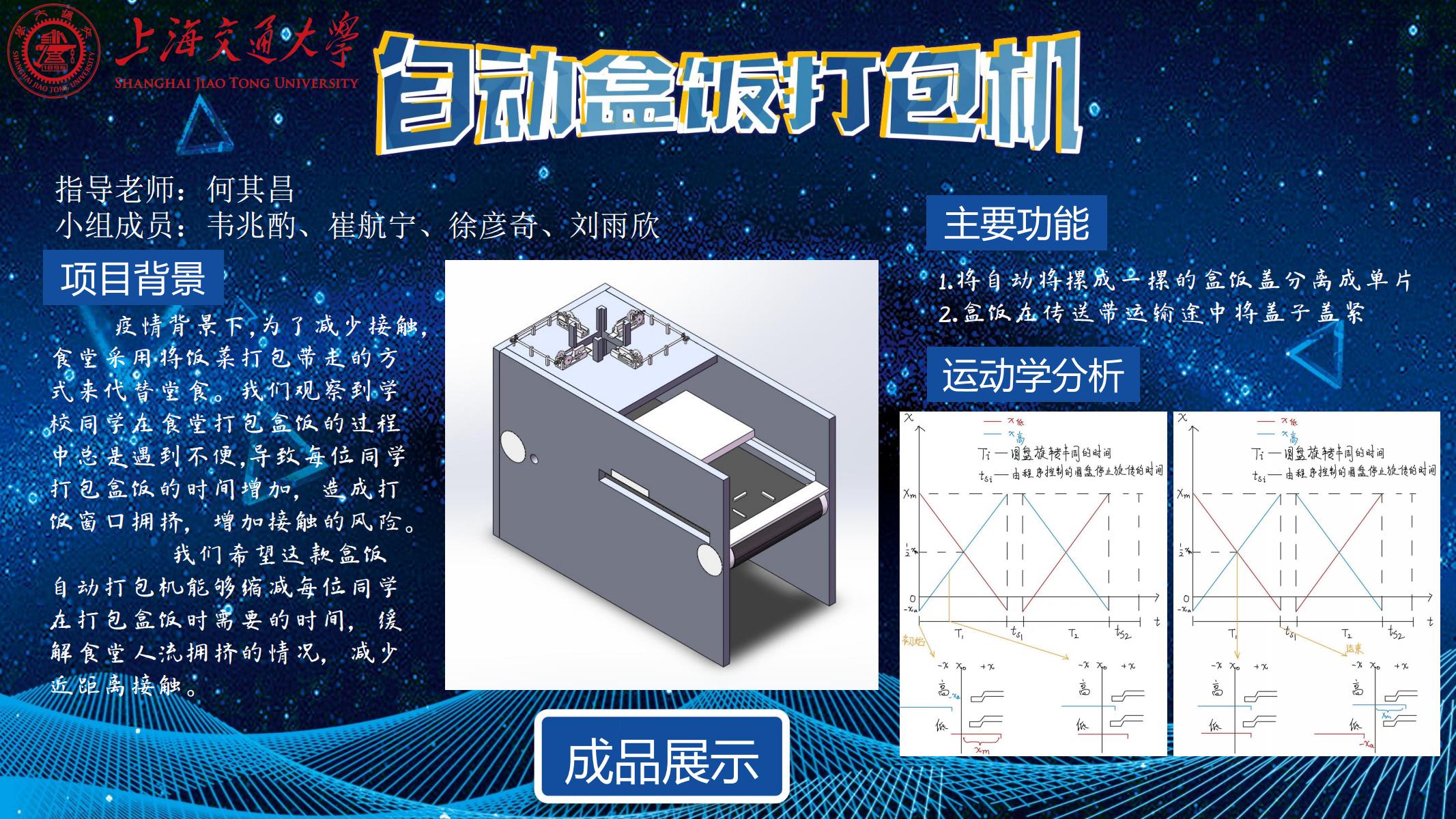我们希望可以设计一款自动盒饭打包机,实现以下两个功能,一是将自动将摞成一摞的盒饭盖分离成单片,二是将盖子盖紧。整个过程中使用传送带,实现“盒饭放置窗口―盒饭盖下落位置―盒饭盖压紧位置―出餐窗口”整个过程全自动流水线作业。我们希望通过设计运动周期和各部分的配合加快整个过程完成的速度,以实现缩短每位同学在打饭窗口前的停留时间,缓解食堂人流拥挤的情况,减少近距离接触,从而避免群体感染的目标。