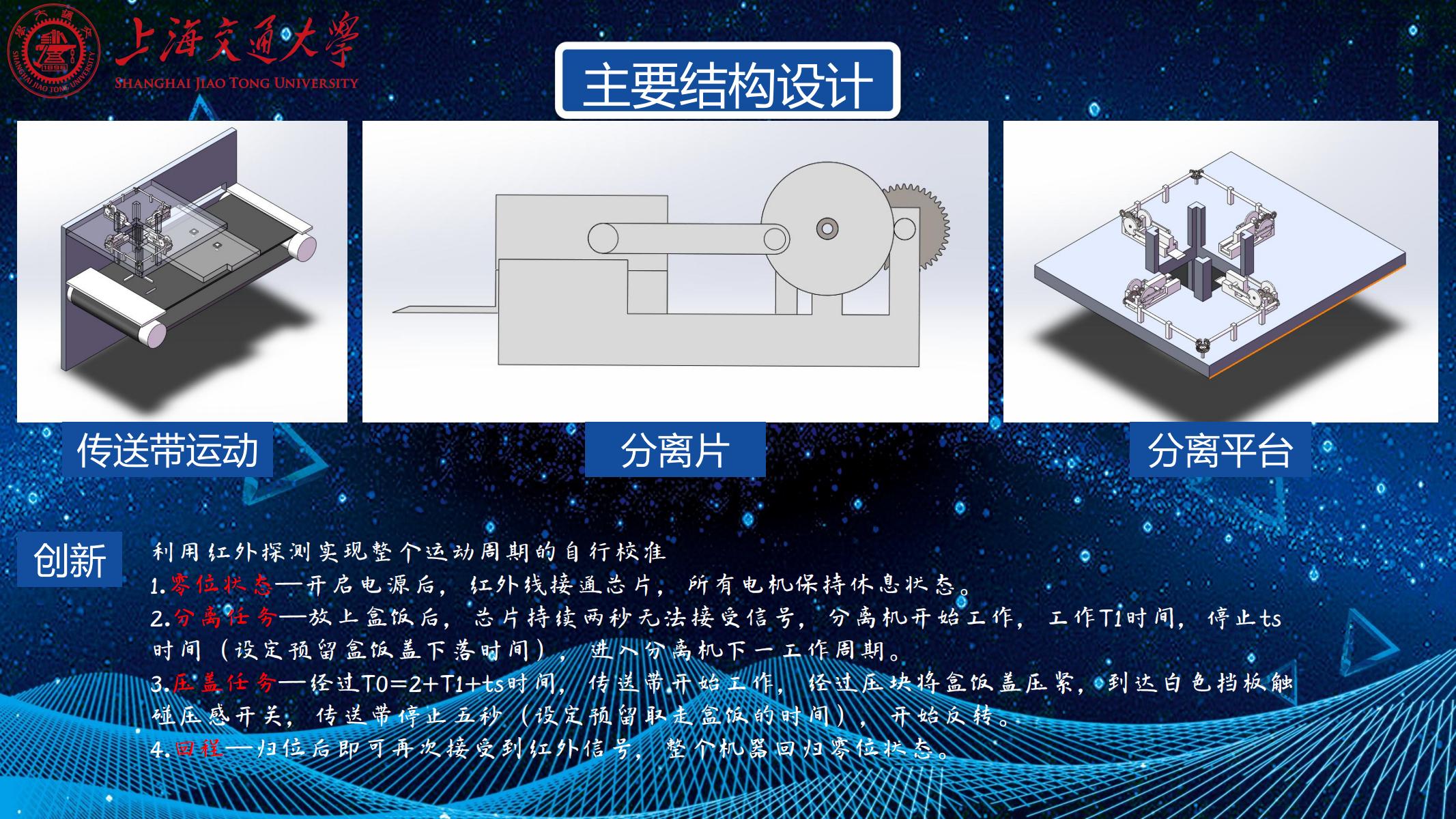 我们采用传送带来完成“盒饭放置窗口―盒饭盖下落位置―盒饭盖压紧位置―出餐窗口”整个过程中盒饭的传送,以实现自动打包盒饭的流水线作业;采用电机与齿轮相结合的方案实现两组分离片的同步运动;采用曲柄连杆机构驱使分离片运动以实现将摞成一摞的盒饭盖分离成单片,并在重力作用下将分离开来的盒饭盖落到盒饭上;采用被动加压的方式,利用弹簧和压块实现将盒饭盖压紧的功能,同时将压块底部设计为弧面以避免卡死的情况。