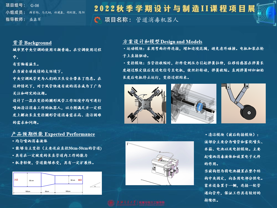 城市里中央空调的使用日渐普遍。在空调使用过程中,室外空气中各类悬浮物不能完全被空调过滤装置所阻隔,造成有害物质滋生。在当前全球疫情的大环境下,四通八达的中央空调风管更为人们的卫生安全带来了隐患。在这种情况下,对于风管快速有效的消杀成为了广为关注和研究的议题。基于这一现状,本项目组利用传感器反馈调节的机理设计了一款在变径的圆形风管工作环境中均可进行喷洒清洁消毒工作的机器人,以力图满足并一定程度上解决长直变径圆形管道消毒需求高、清洁困难的需求和问题。
