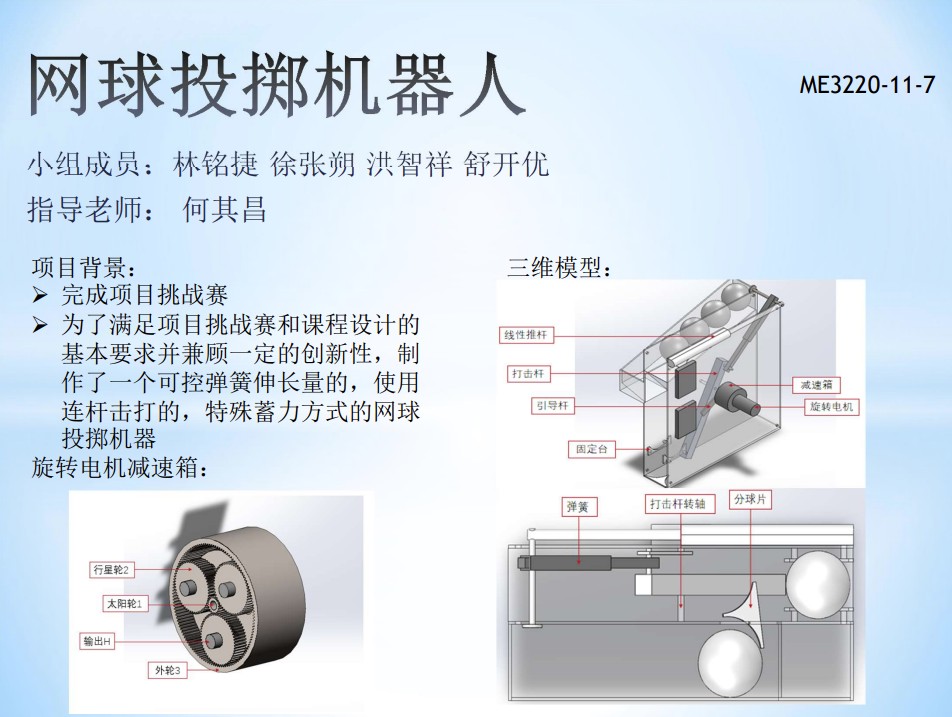 本项目项目名称为网球发球机器人,我们小组结合本课程所学的机械结构原理以及项目挑战赛的相关要求,制作了一个可控弹簧伸长量的,使用连杆击打的,特殊蓄力方式的网球投掷机器人。首先通过电机控制的推杆推动打击杆转动,此时连接在打击杆尾部的弹簧开始蓄力,待打击杆将弹簧拉至最大伸长量时,推杆不再限制打击杆,此后弹簧快速收缩,拉动打击杆实现对网球的击打。再一次击打结束后,在装置顶部的线性推杆会收缩,弹簧尾部连接在线性推杆上,可以实现弹簧初始位置的改变从而减小弹力,由此可以控制击球的距离。在打击杆向上旋转的过程中会拨动分球片实现下一个网球的安装。由此可以实现对网球的击打以及下一次击打的准备工作。