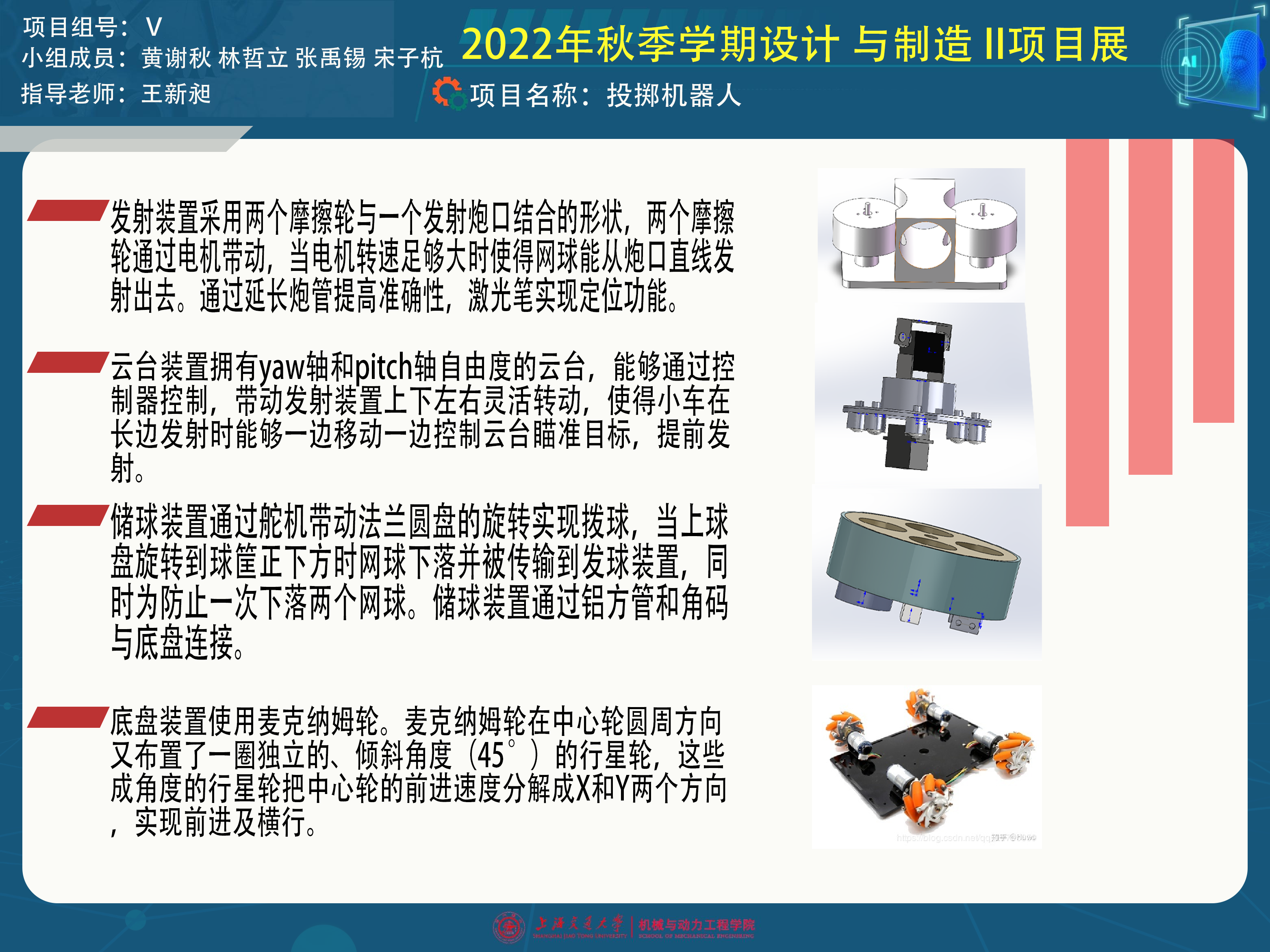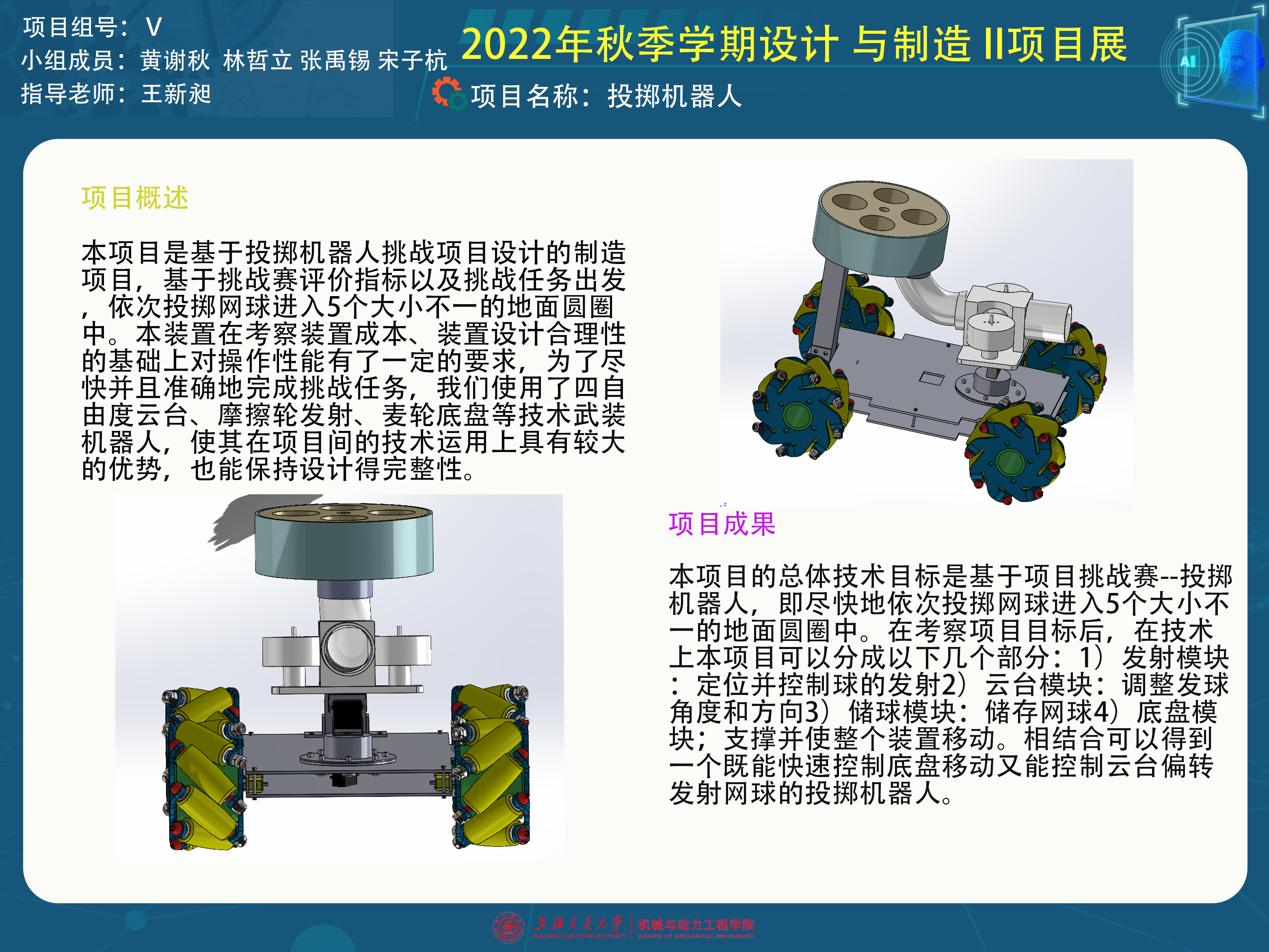 本项目在基于挑战赛目标的要求以及设计与制造2课程的要求下完成了一系列原理分析以及实物制作的成果。在原理分析上,我们依靠摩擦轮技术以及云台技术设计了云台发射模块,有着相当成熟的3d建模。底盘也依靠麦轮及其相关代码完成了底盘实物的制作以及控制内容。除此之外,我们还完成了自由度分析、控制逻辑时序、运动学及动力学分析、零件选择、设计校核等设计与制造2课程的内容,在与课堂相结合的过程中也有着颇丰的收获。