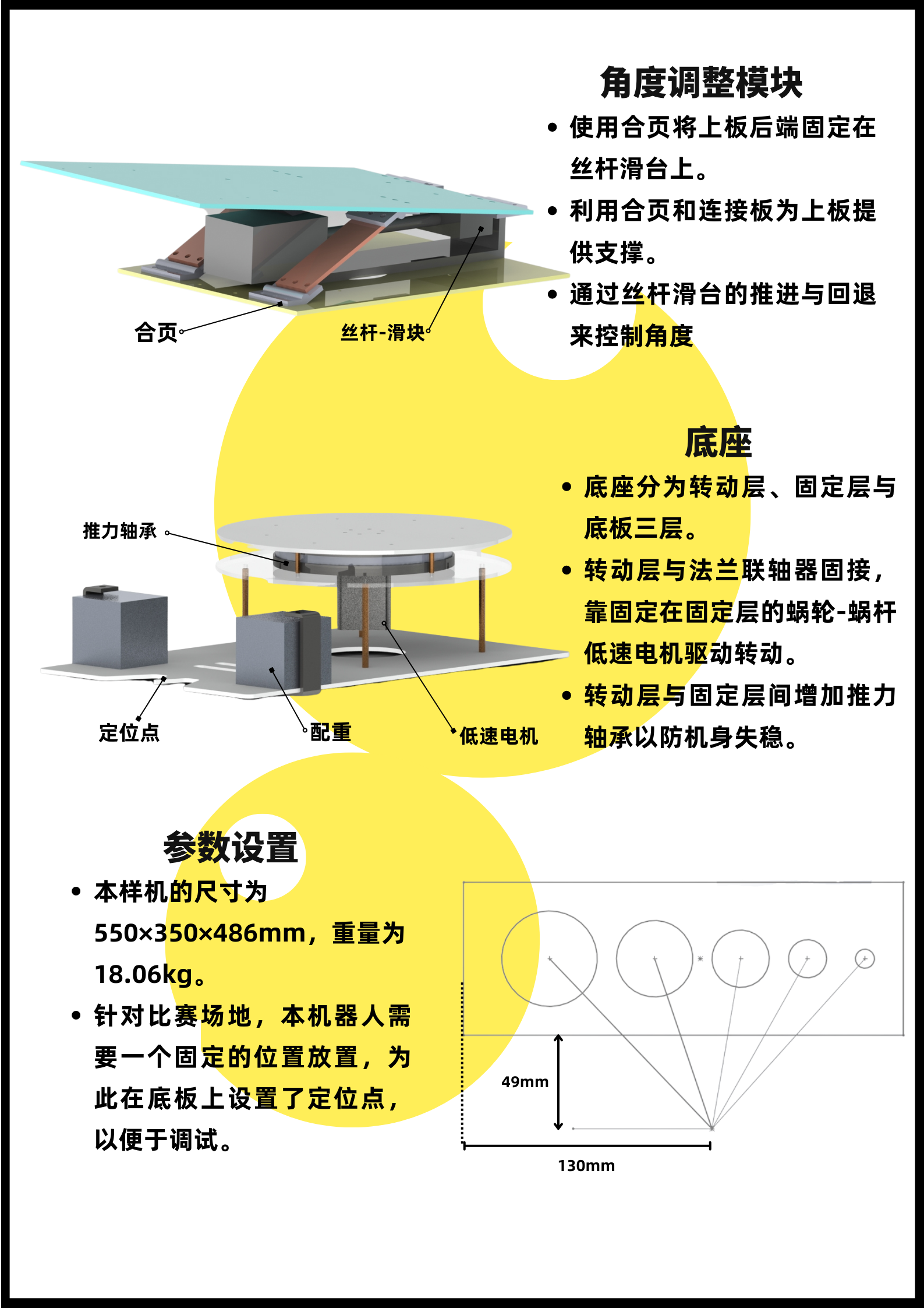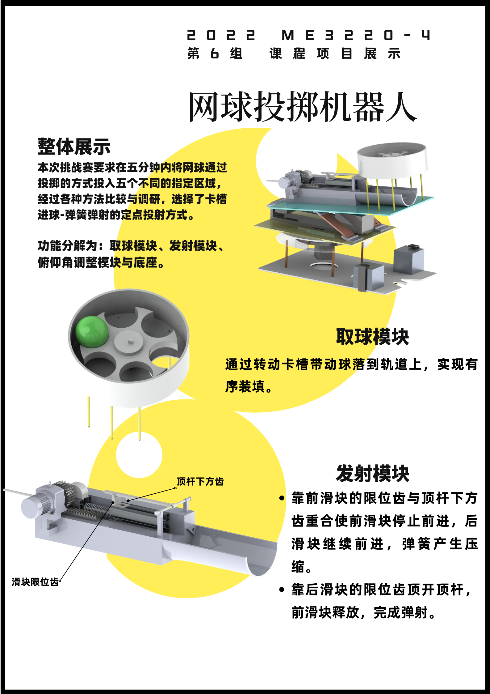 本项目制作了一台基于弹簧蓄能机构发射网球的投掷机器人虚拟样机,通过调整俯仰角度与水平转角,从理论与仿真上实现了定点多目标投掷的功能。