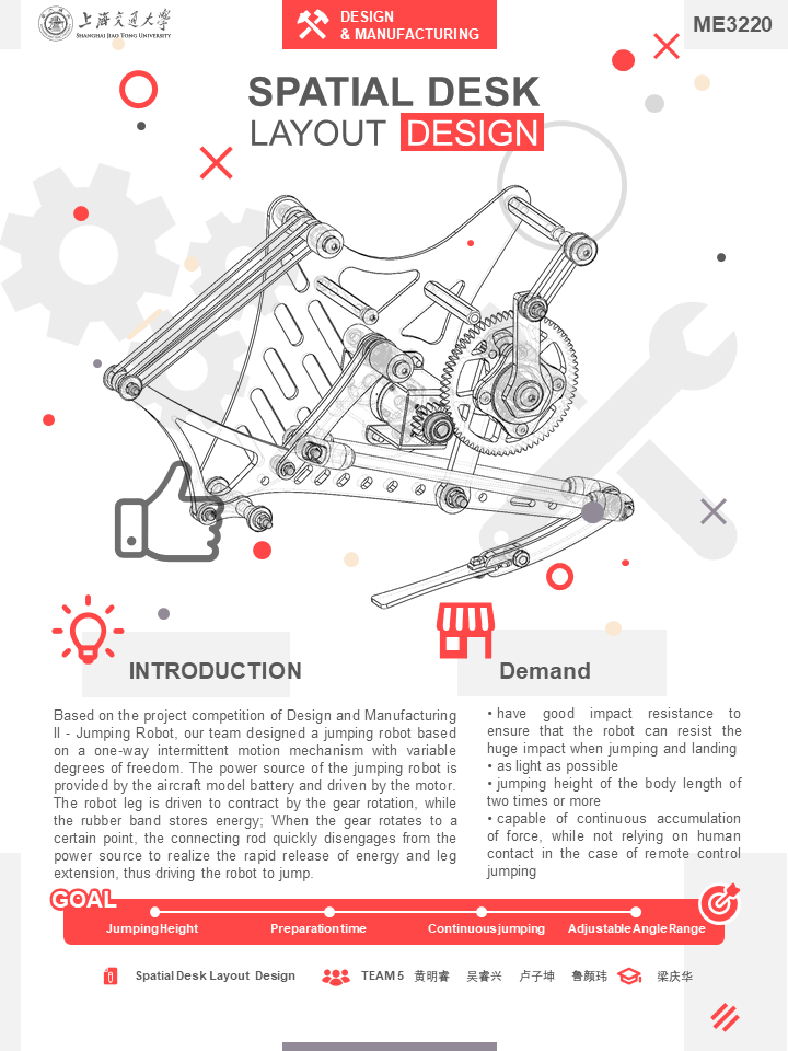 基于设计与制造Ⅱ课程项目所设置的项目挑战赛——跳跃机器人,本组设计了一种基于变自由度单向间歇运动机构的跳跃机器人。该跳跃机器人动力源由航模电池提供,由电机驱动,通过齿轮旋转带动机器人腿收缩,同时橡皮筋蓄力储存能量;当齿轮旋转至某一点后,连接杆迅速与动力源脱啮合,实现能量的迅速释放和腿部伸长,进而带动机器人实现跳跃。同时利用辅助橡皮筋,降低了电机最大负载。机器人重新落回地面后,仍可以继续由电机带动蓄力。同时,基于ESP32控制板,实现了利用蓝牙在手机进行远程遥控跳跃的功能。