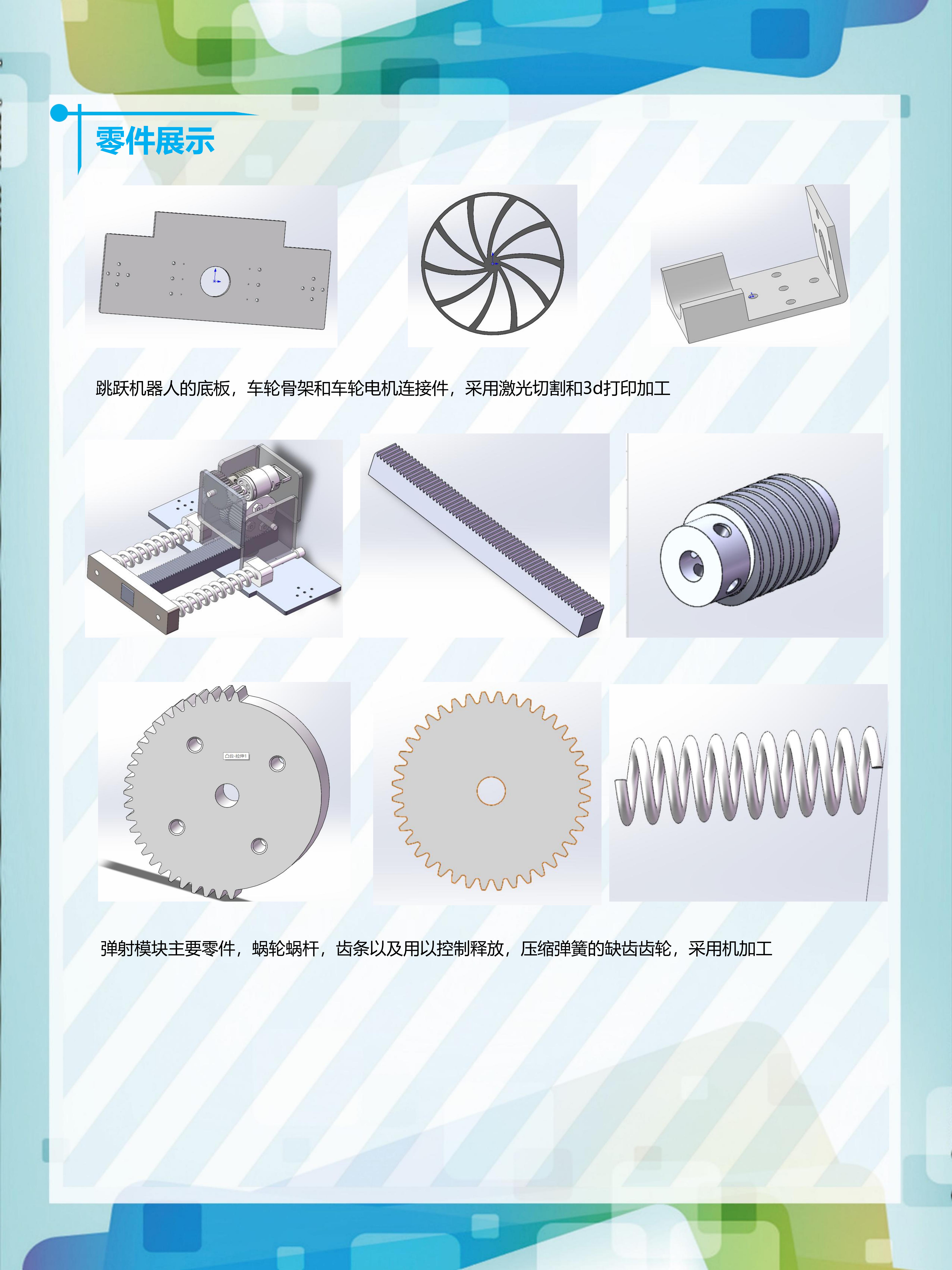 随着科学技术的发展,无人装备已经在城市或者农田的各种场景下得到了广泛的应用。同时,面对缺乏基础设施(或者基础设施损毁)的场景,如崎岖的山地、震后的废墟、爆破现场等复杂的环境,人类也不会停下探索的脚步。跳跃作为一种点对点的运动方式,对点与点之间的通路没有过多要求,天然适合上述复杂场景。除此之外,随着各种载荷(如摄像机、电机、电池)等质量的减小,装备可以做的更小、更轻便以增强通过性能,也更便于携带。综上所述,一款小型跳跃机器人(车)可以有效适应缺乏基础设施的场景。