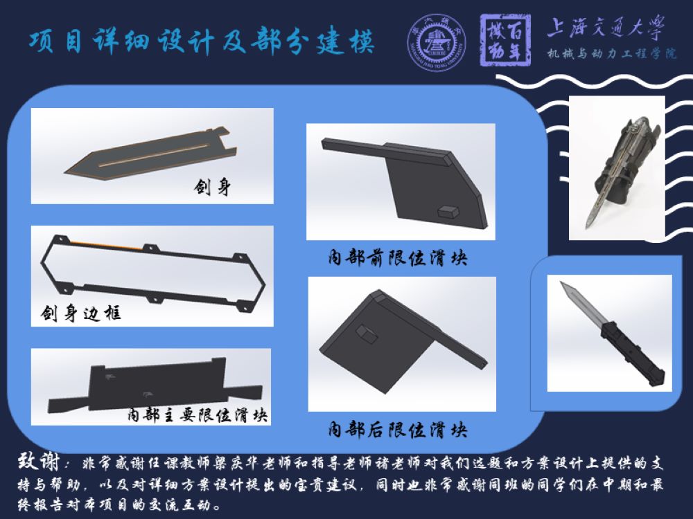 本项目旨在于设计一个类袖剑装置。此装置可以如游戏以及影视作品《刺客信条》中一样绑在手臂上并隐藏在衣服袖子内。除了传统意义上的剑,我们的类袖剑装置还可以将一些其他轻薄的物品放在装置中。只需要手指的拨动,装置内的物品就可以实现快速弹出和快速收回。这个装置兼具实用性和观赏性,在日常生活中也有应用价值。例如可以把二维码放置在装置内,在需要扫码时可以快速出示,节省了打开手机的时间。