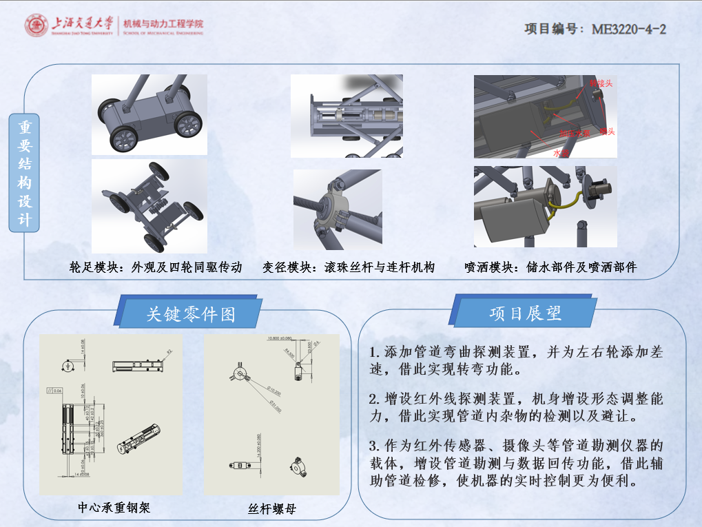 最终产品设计中,我们将管道机器人根据功能划分为轮足子模块、丝杆滑块子模块和喷洒子模块。轮足子模块为机器人整体的前进提供动力,同时利用连杆部分实现机器人与管壁之间的支撑。丝杆滑块子模块通过电机带动丝杠转动,控制轮足子模块的撑开和缩小,从而实现变径功能。喷洒子模块实现液体封装,以及管道内的消毒液喷洒。我们通过受力分析以及功率计算等步骤,合理规划车身大小及内部空间,正确选取零部件和连接方式,对材料进行强度校核,为最终产品设计和装配环节提供了充足的理论数据支持。我们通过ADAMS仿真分析我们所设计的管道机器人的实际工作情况,仿真结果也较好地符合了预期。