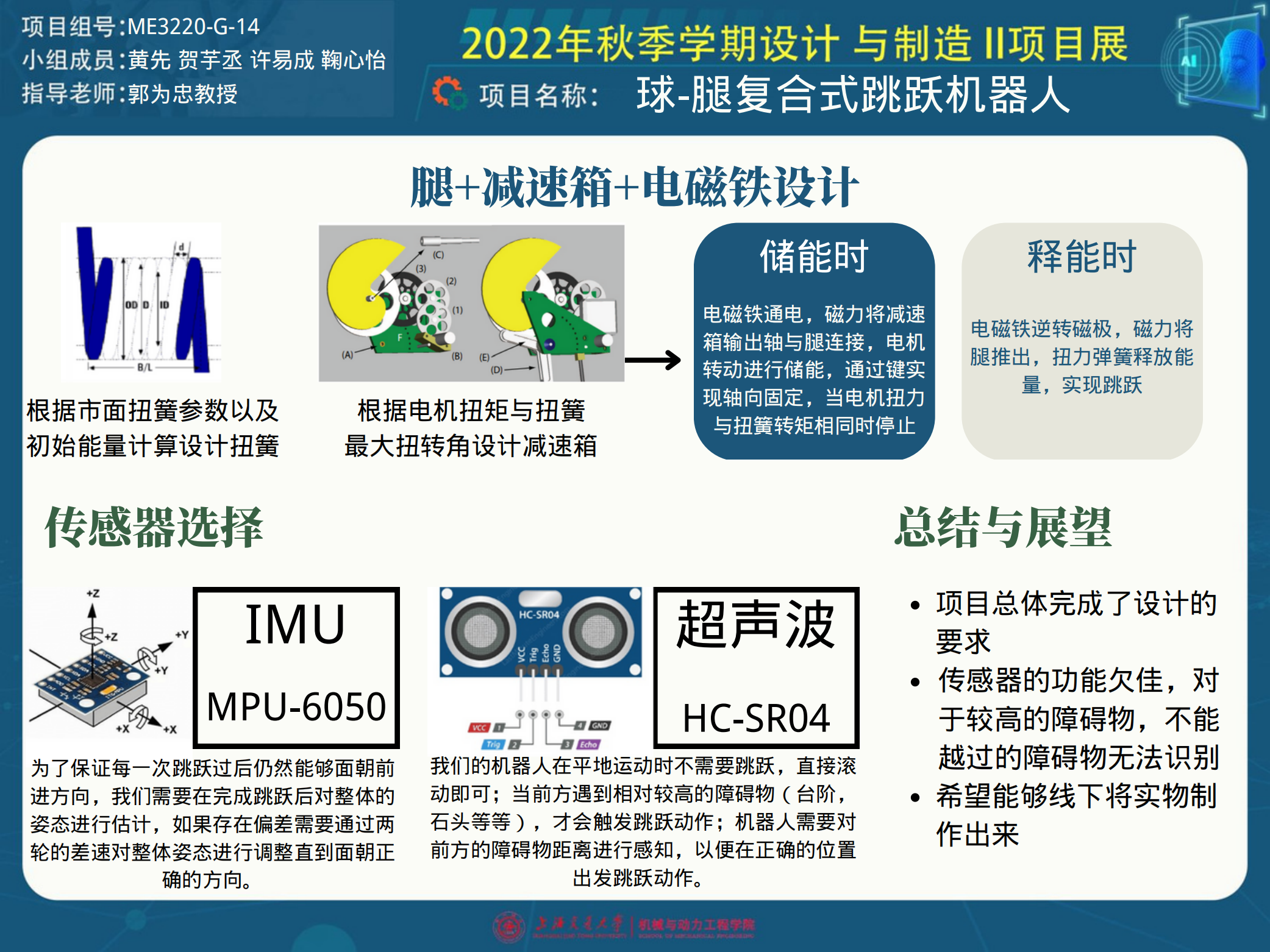 实现基本的运动模式,包括在平地上的前进、后退、转弯等等操作;实现通过距离传感器测量与前方障碍物的距离;实现通过姿态传感器测量自身姿态变化;实现电机、减速箱、四连杆装置以及扭力弹簧的储能,释能过程。实现各个系统的控制与通信。最终希望跳跃时以75°仰角进行起跳,跳跃高度达到1m,姿态检测的误差在1°上下,距离检测的误差在1cm上下。