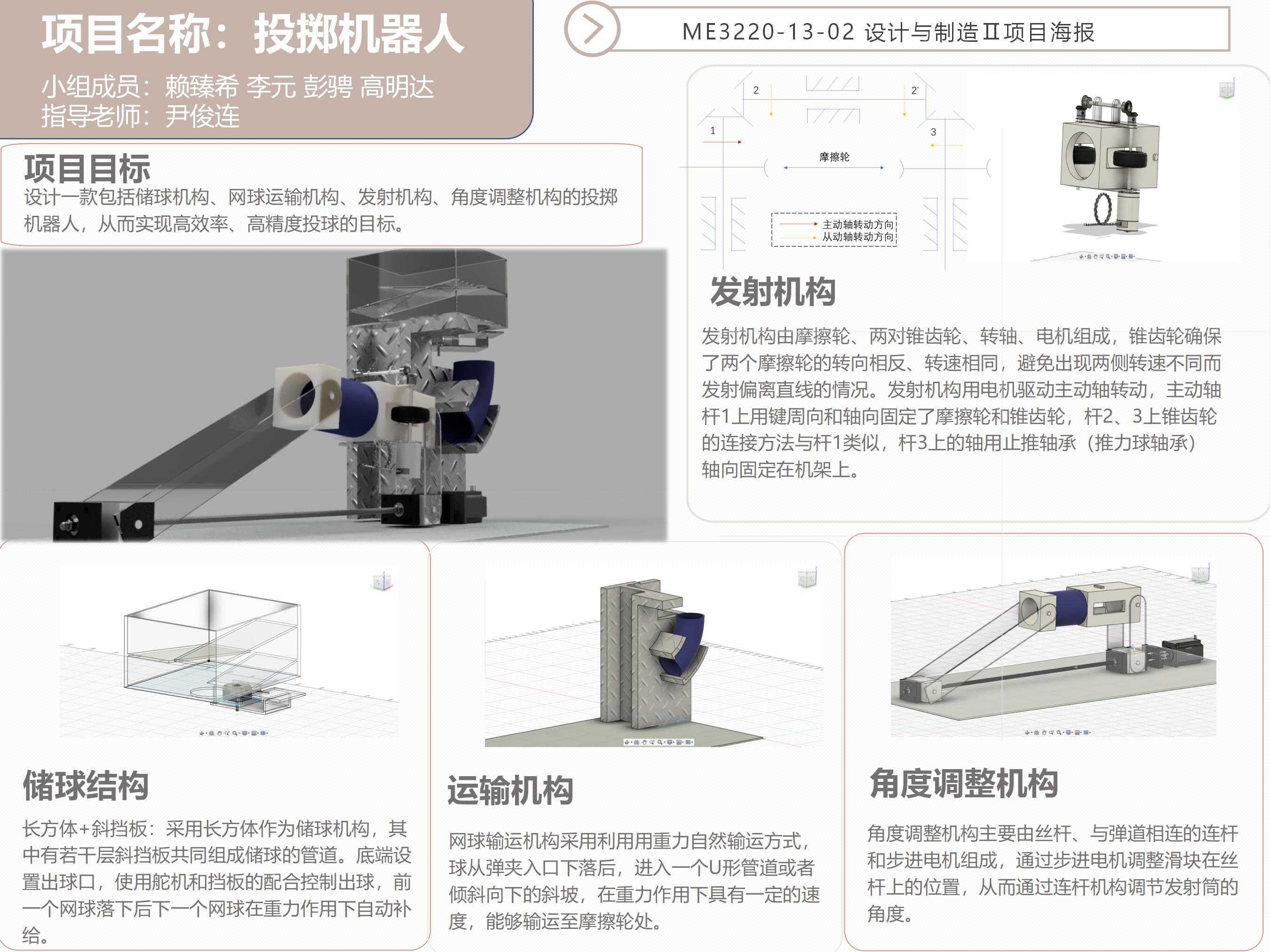 要实现投掷动作,最主流的方案有:(1)摩擦轮方案:(2)气动方案;(3)弹簧蓄能方案。本小组考虑到发球结果的精准度、稳定性等条件,最终选择了摩擦轮方案。