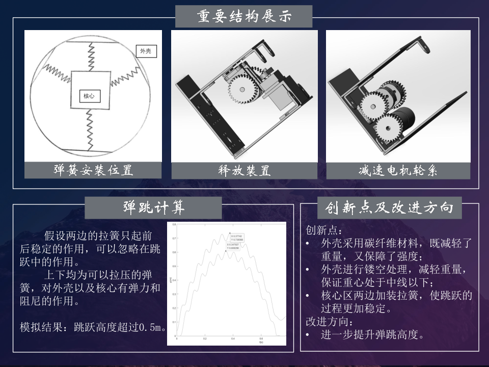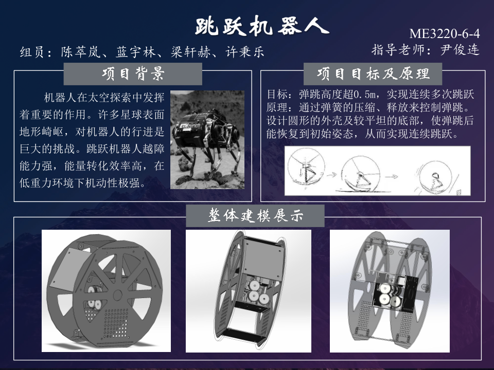 随着人类对太空的深入探索,太空的可及之处越来越多,然而载人探测风险大、成本高,机器人在太空探索中发挥着不可替代的作用。目前机器人行业蓬勃发展,带来了很多技术革新,人们考虑设计一些跳跃机器人来满足各种环境的需要。例如大多卫星小行星表面地形崎岖,环形山密布。传统轮式机器人越障能力不足(玉兔号月球车可以20度爬坡,20厘米越障,仍然无法翻越高山与复杂地形),这促使我们研发新型足式机器人、爬行机器人。它们越障能力强,但控制难度高,能量效率低。基于这种情况,本小组决定研制能够满足更高跳跃高度的跳跃机器人。