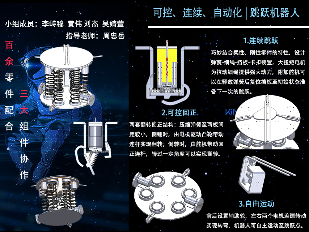 利用Arduino单片机作为控制、通过控制六个弹簧的压缩蓄力和突然释放,把所蓄能量转换为机器人的动能,让跳跃机器人实现可控的跳跃,并且能够达到一定的跳跃高度。